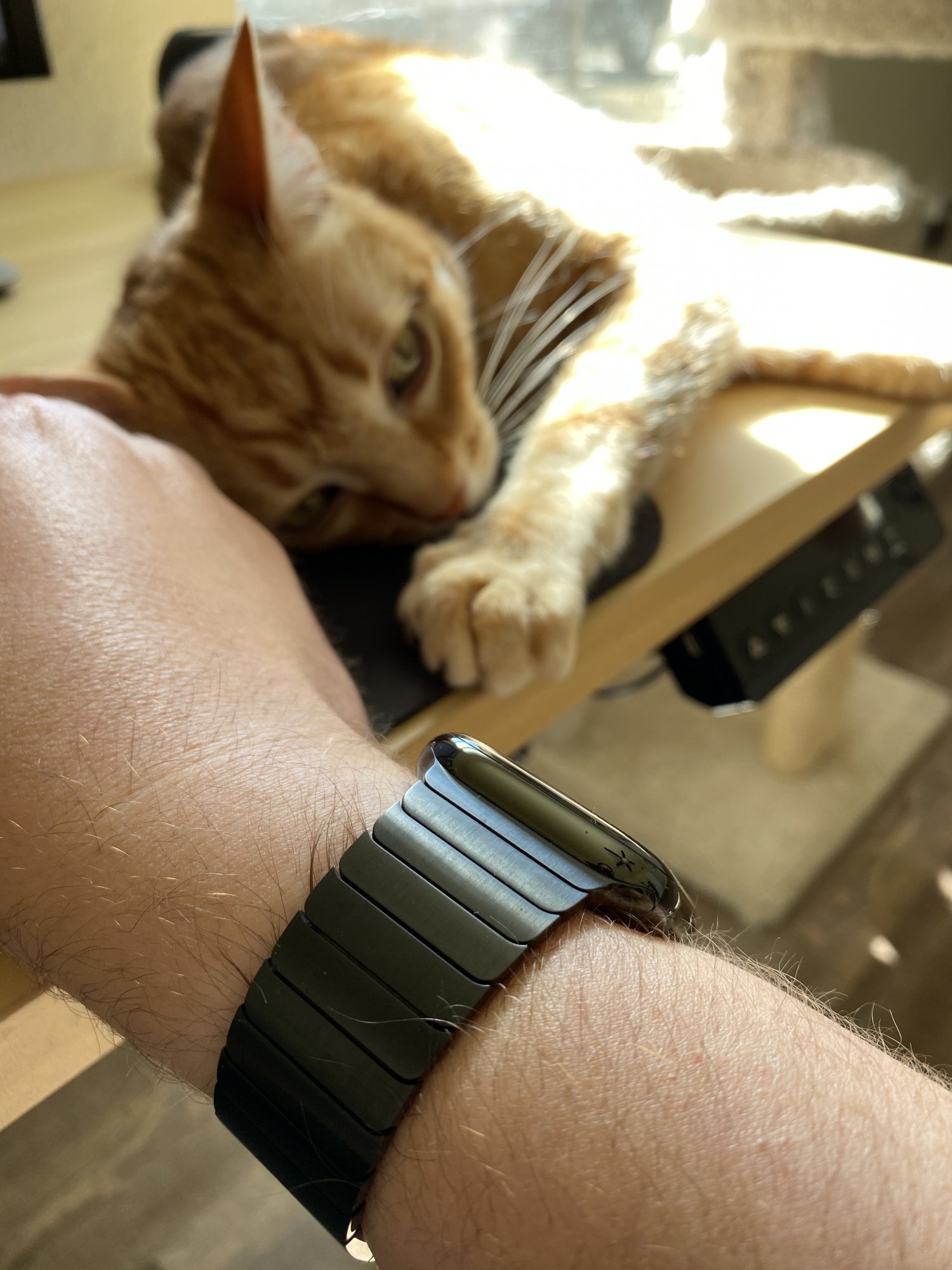 My cat and I are having a disagreement about whether I really need to be doing work right now. Also pictured: space black link bracelet.