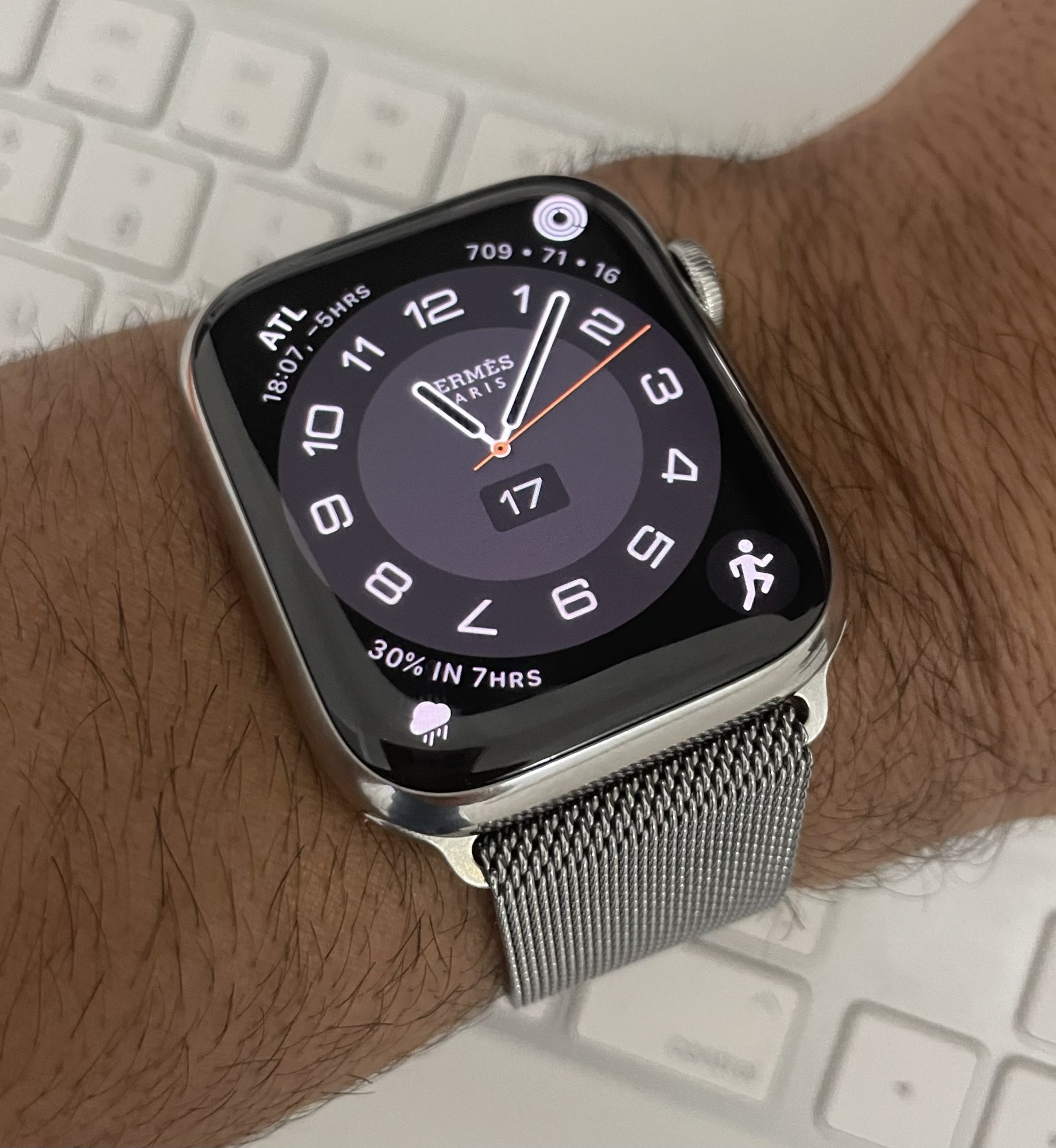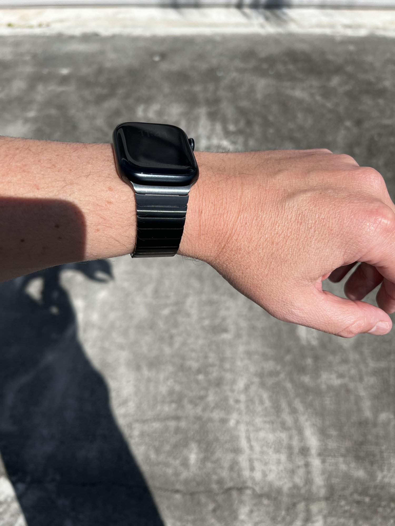 Here it is inside with somewhat bright lighting. It matches well enough that I didn’t even open my Series 7 Hermès Space Black box and returned it and saved $960 and went with the Midnight. It matches better than the picture makes it look. The outside edges are a little shiny in the picture, but the brushed look of the link bracelet goes pretty well with the Midnight casing.Does the stainless steel band match well with the Midnight color in different lighting? Or can you tell the case and the band apart easily? I have the same band and it's annoying that they only sell the space black case with the Hermes.