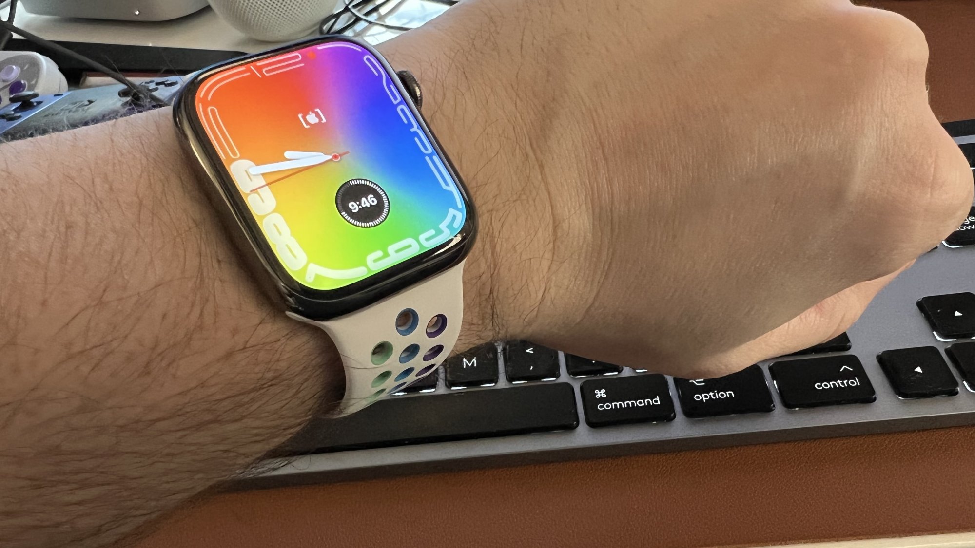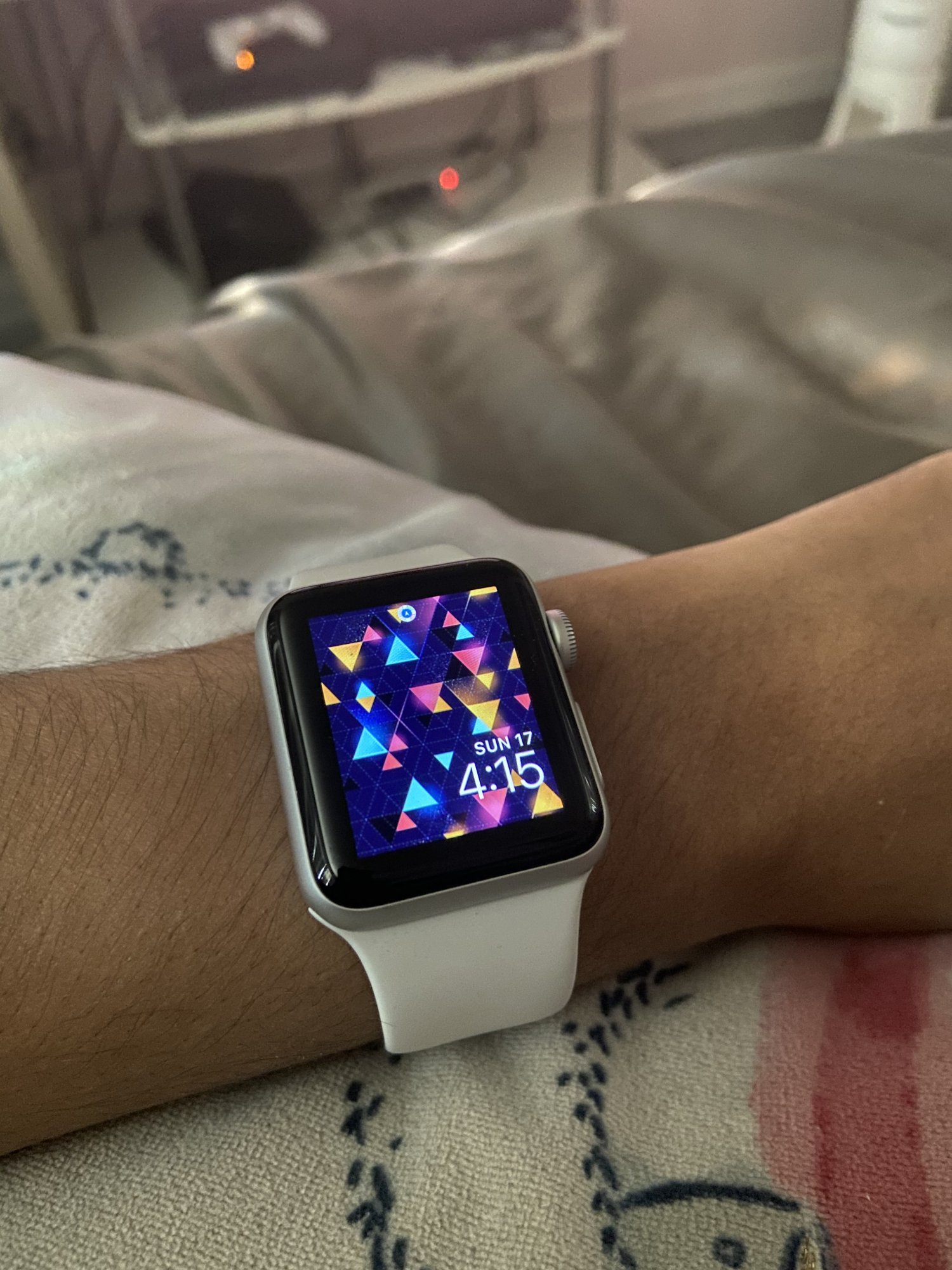 This my 38mm series 3 watch which I only really use while traveling. My wrists are pretty tiny, especially on my left arm, so I’m wondering now how ridiculous the 45mm size would look on it 🤣.