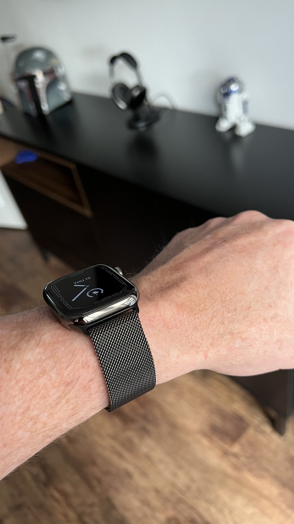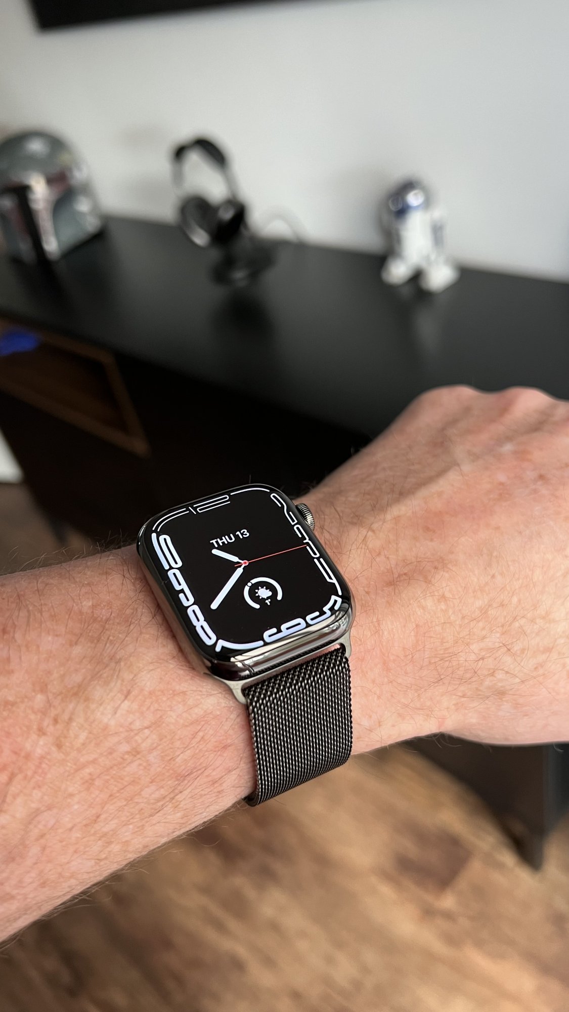 Looks stunning. This SS graphite is really beautiful!...So I sold my 41mm Starlight and opted for the 45mm stainless graphite 😳. I have tiny arms but already have some 42/44/45 mm bands. And just bought a couple of new ones. Here shown with grapefruit 🤩