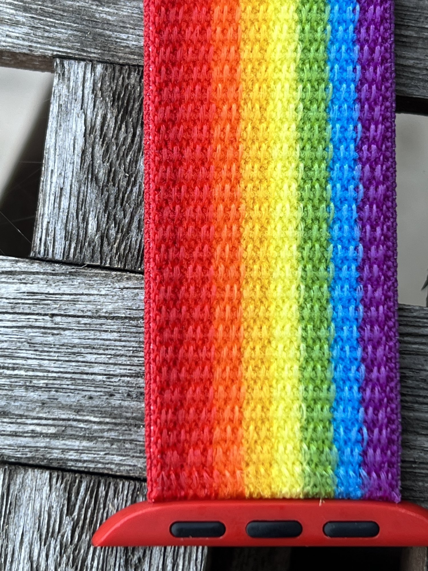 The classic pride flag is actually the Gilbert Baker with hot pink first and then turquoise later on, which I just learned from some Nike shoes. Apparently the “classic” is some watered down corporate crap.Thanks for the close up. I don’t have the band, so I was always going by Apple renders or more distant shots, in which stripes 2 and 3 came across as sometimes two oranges vs two reds. But inspecting the close up, it’s more like:
