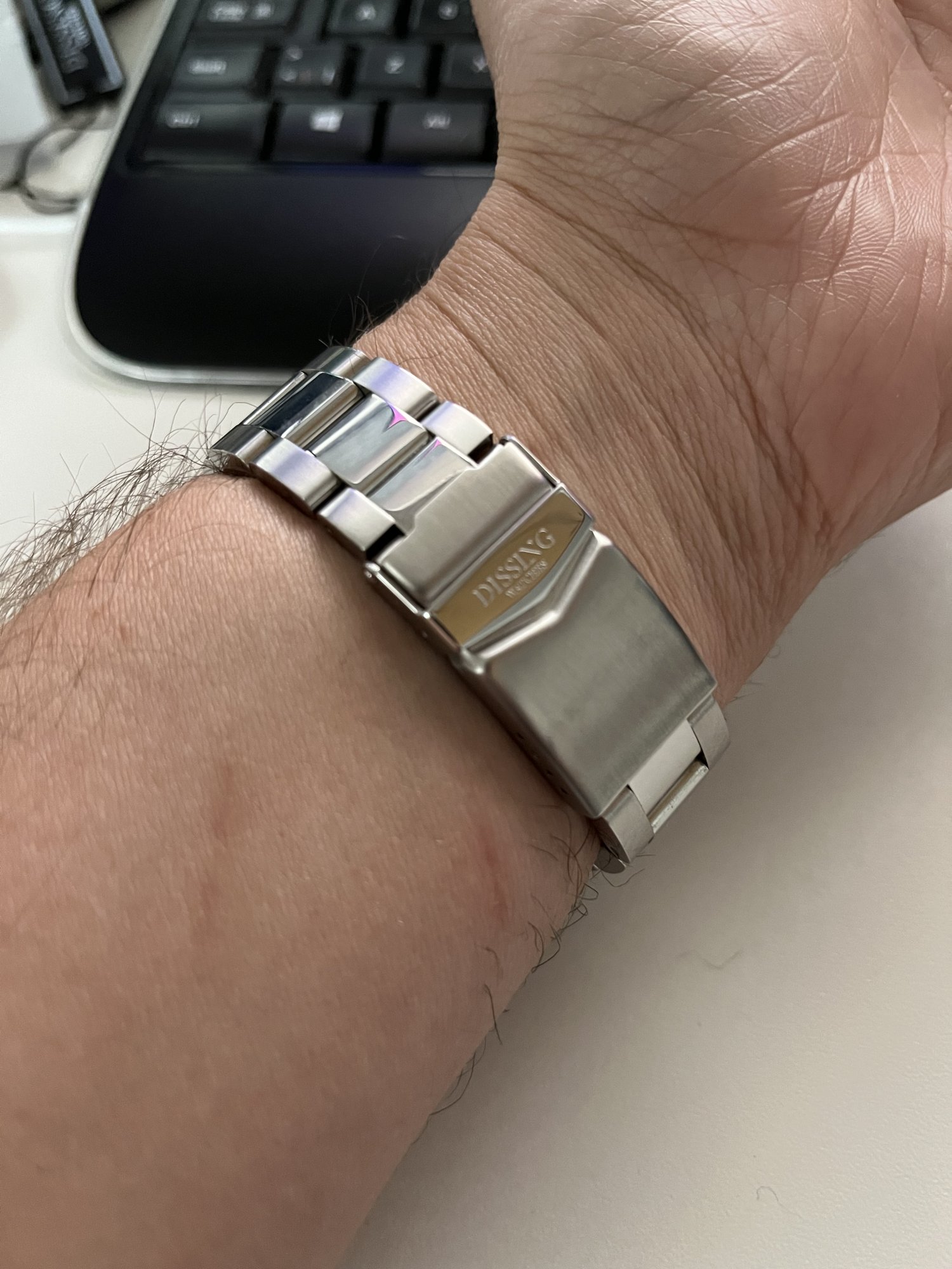 A modded Oyster band (from a Dissing Watch) to fit the Apple Steel Watch.