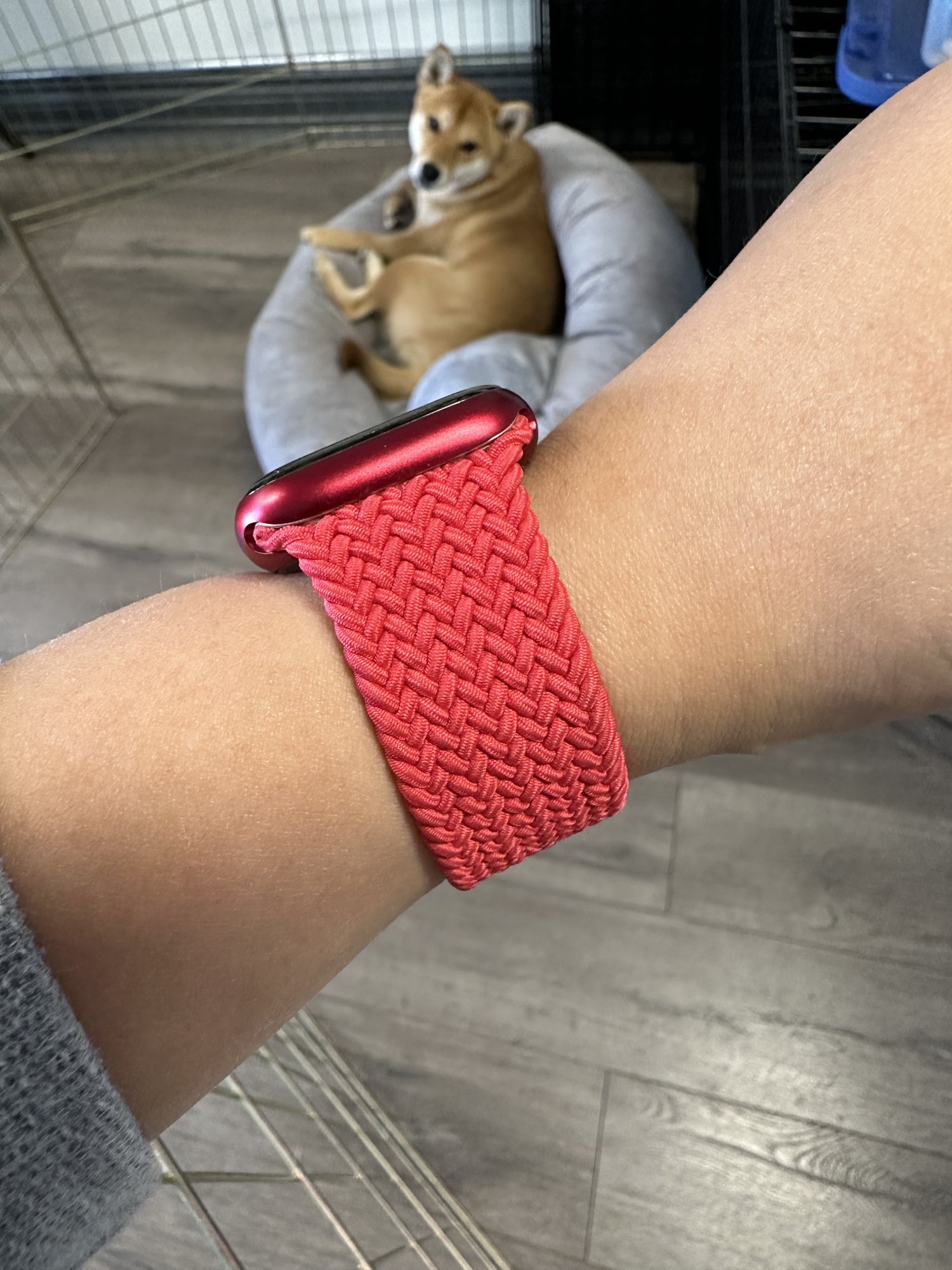 Series 7 with braided solo loop. Got 2 size down from what it said on Apple website after measuring, and it was pretty tight at first but now my wrist has adjusted to it rather than the band. Bonus photo with micro camera.
