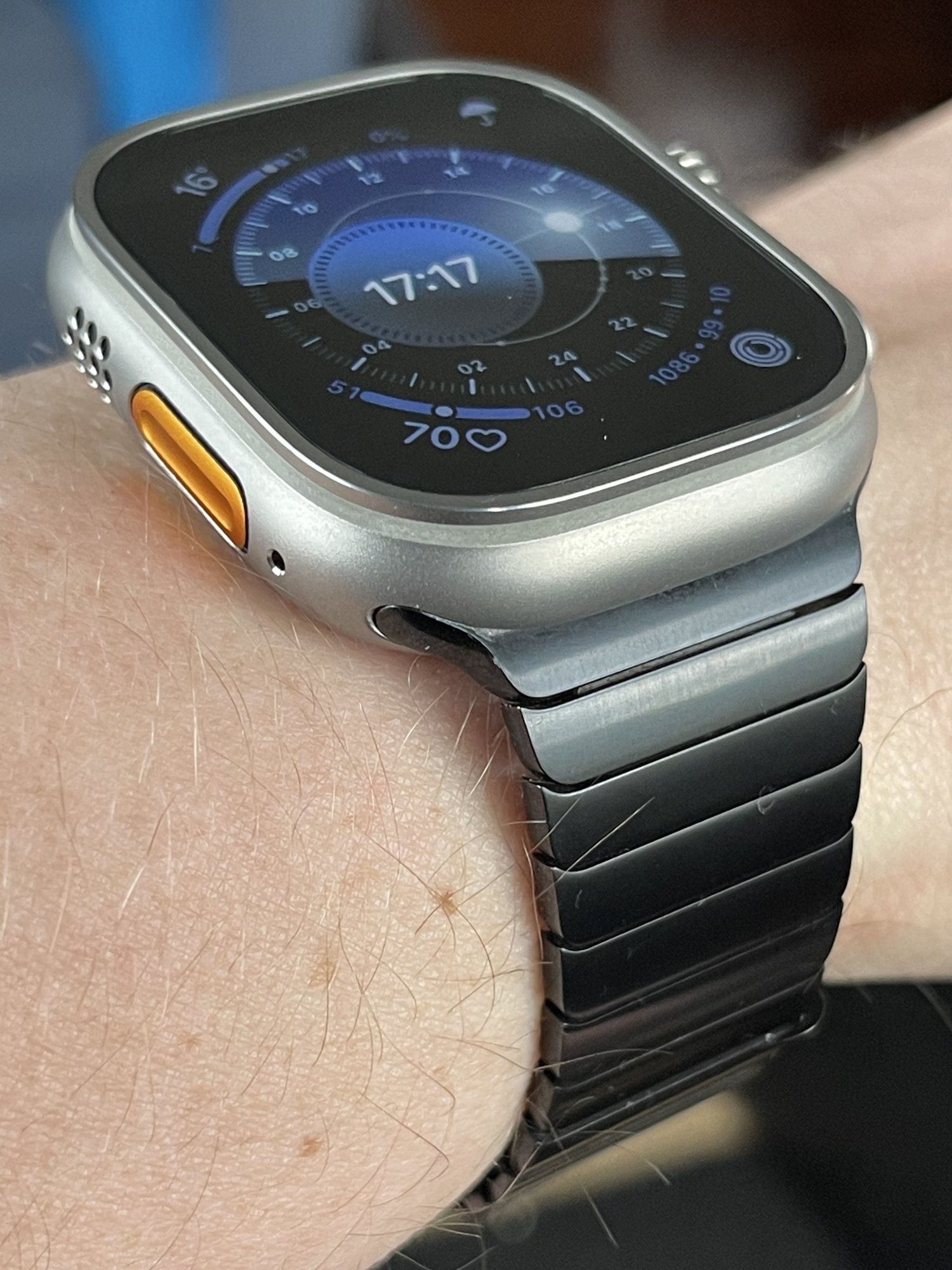 Apple Watch Ultra with Apple’s Space Black link bracelet. I dunno why, but something about this combo with the Solar Dial face screams “dive watch” to me.