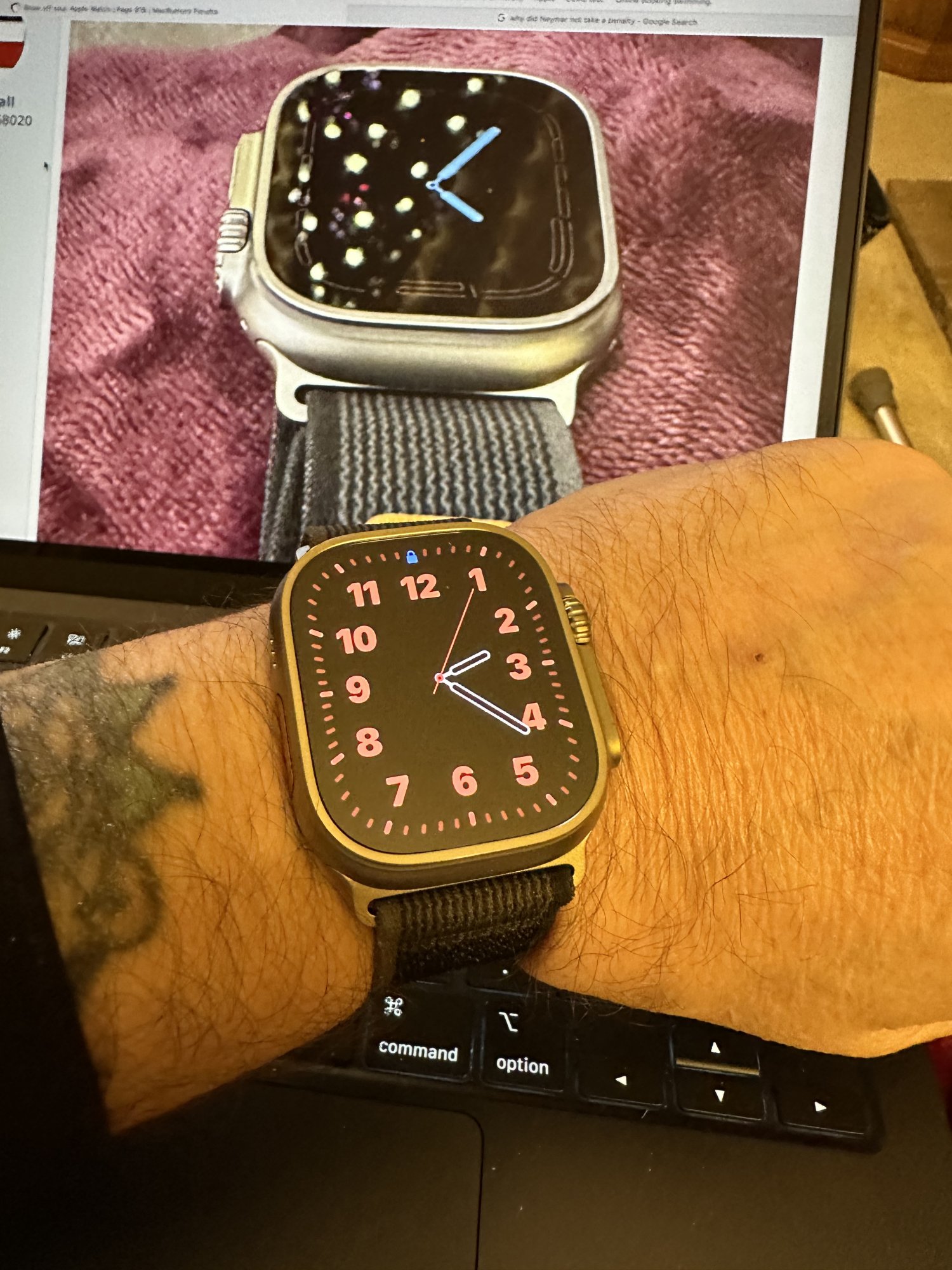 Not my picture but it's the only one I could find:ok ok loving the nomad bands but having a hard time deciding on the blue vs dune. Only issue is i haven't seen the dune on an Ultra! Anyone....