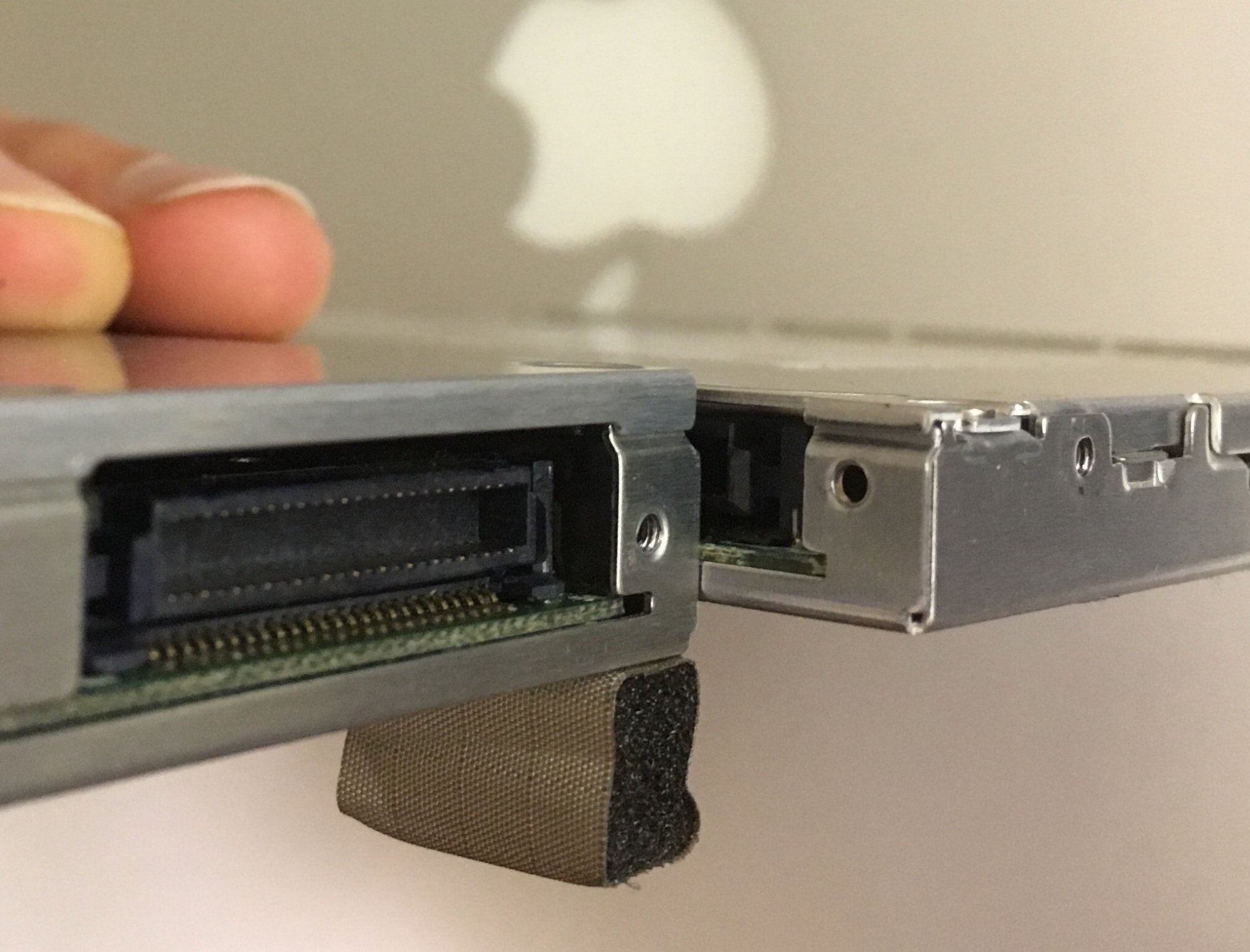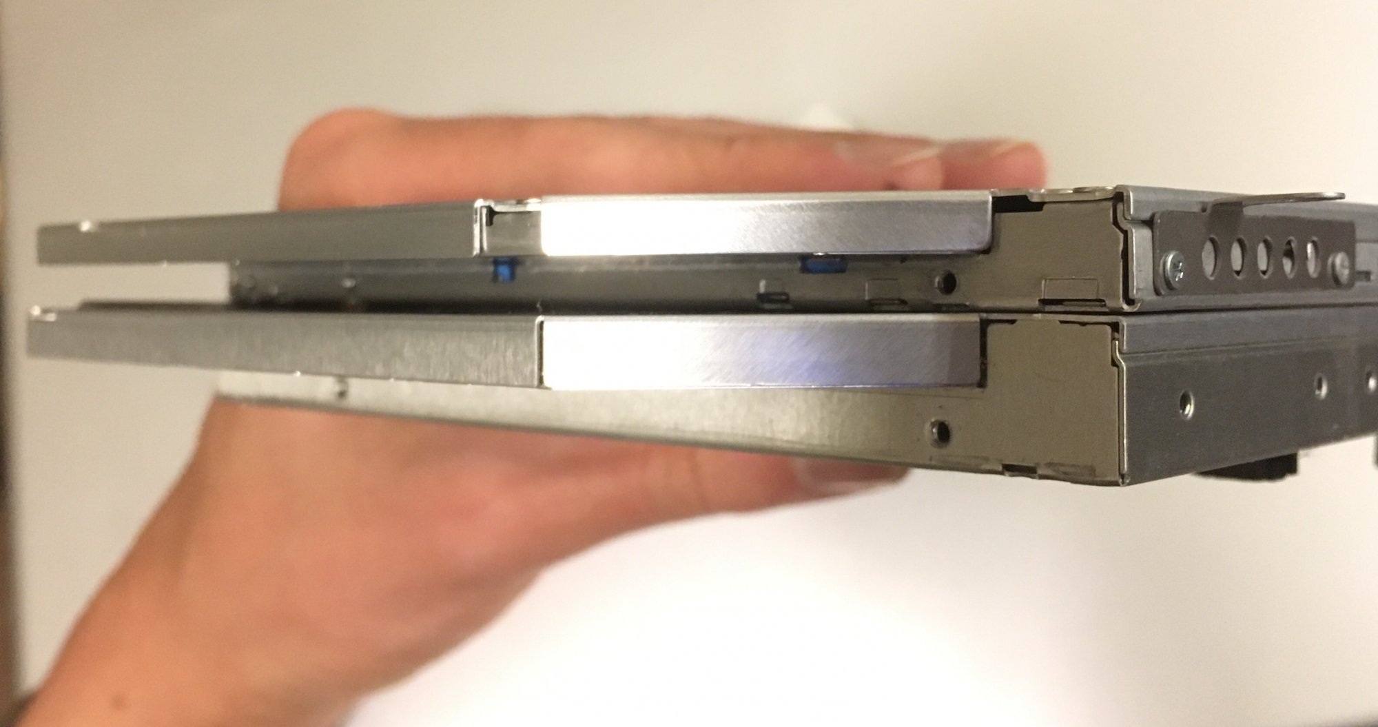 This actually may be the kicker. The drive slot itself may be positioned in such a way that it would make a 9.5 mm drive unusable; though I'd have to open up the ol' battleship again to actually check. One other possibilty I've thought about is using the optical drive brackets from a 15" MacBook Pro in the 17", it seems like the only difference between the two drive brackets is the added depth to account for the extra bottom thickness of the 12.7 mm drive.