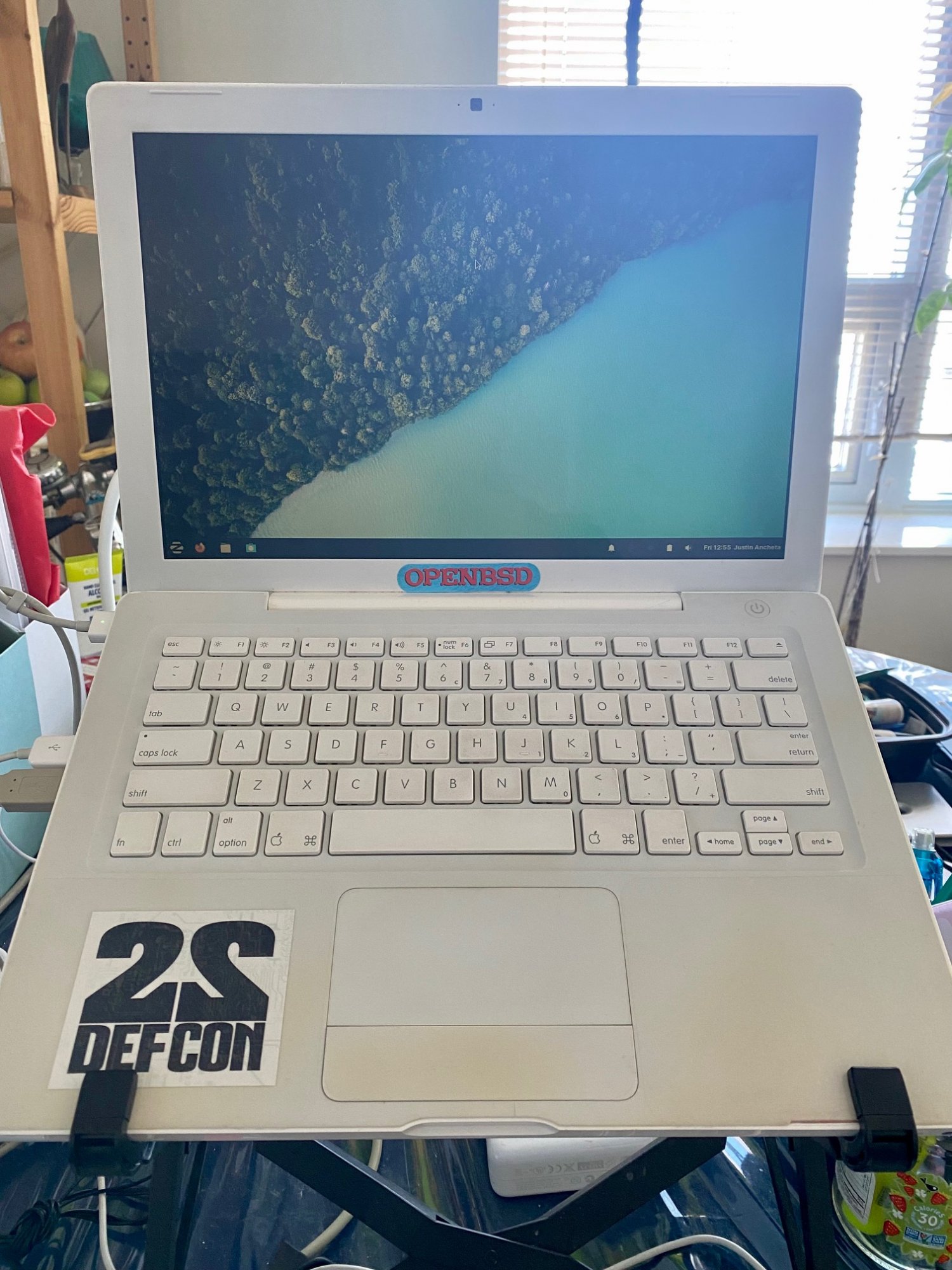 This machine came into my collection many years ago, festooned in Def Con 22 and EFF stickers (plus stickers that seem to reference Blowfish), and I'd always wondered what the story was with this MacBook and the person who originally owned it. Def Con 22 took place in 2014, so I wonder how wild it would have been to show up at a party like that rocking eight-year-old Apple hardware running OpenBSD.