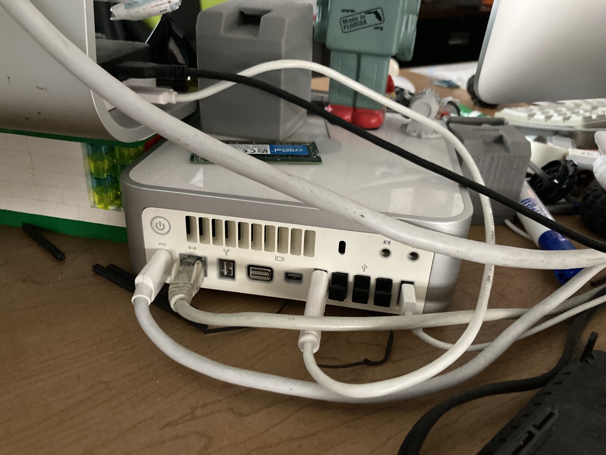 The second machine on my desk, this computer runs two additional screens to get a total of 5 screens on my desk (2 on the mini, three on my main iMac). It works perfectly with Universal Control so that I can use a single keyboard and mouse across all five screens.