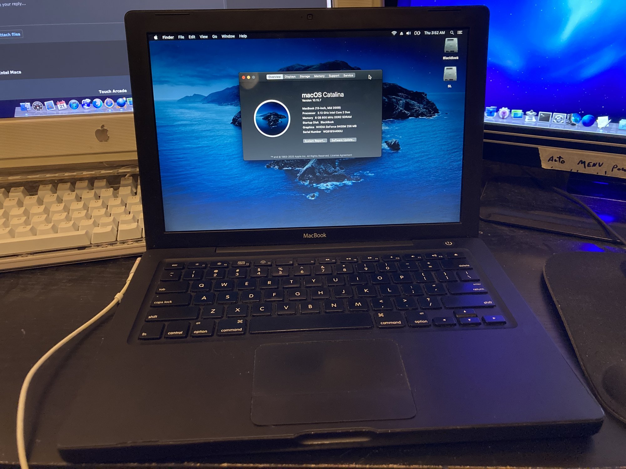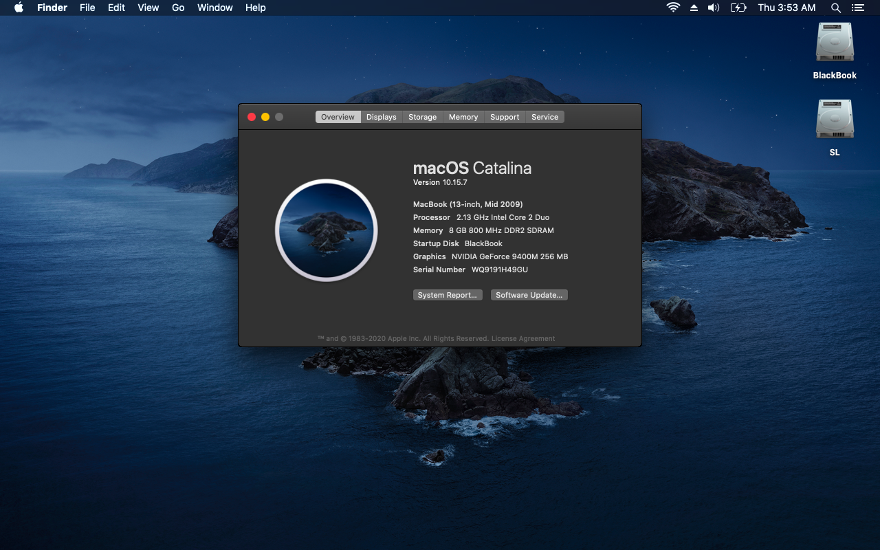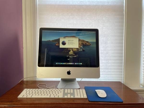 Here's my shiny early 2009 20" iMac. It's a 2.66 Core 2 Duo, Nvidia 9400M model with 8 GB RAM and a 64 GB SSD. Now running Catalina, surprisingly well, using the DosDude1 patch, although there are a few strange bugs including the screen randomly resetting to maximum brightness every ~5 minutes. My biggest gripe is the fan noise - this thing is loud. Since I only need it for occasional compatibility with older stuff it stays powered off most of the time.