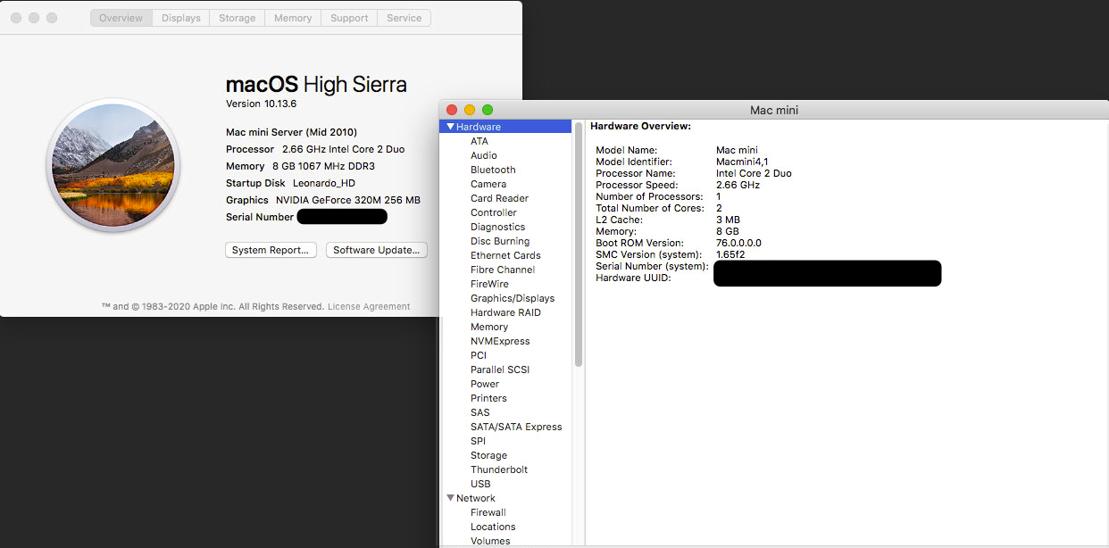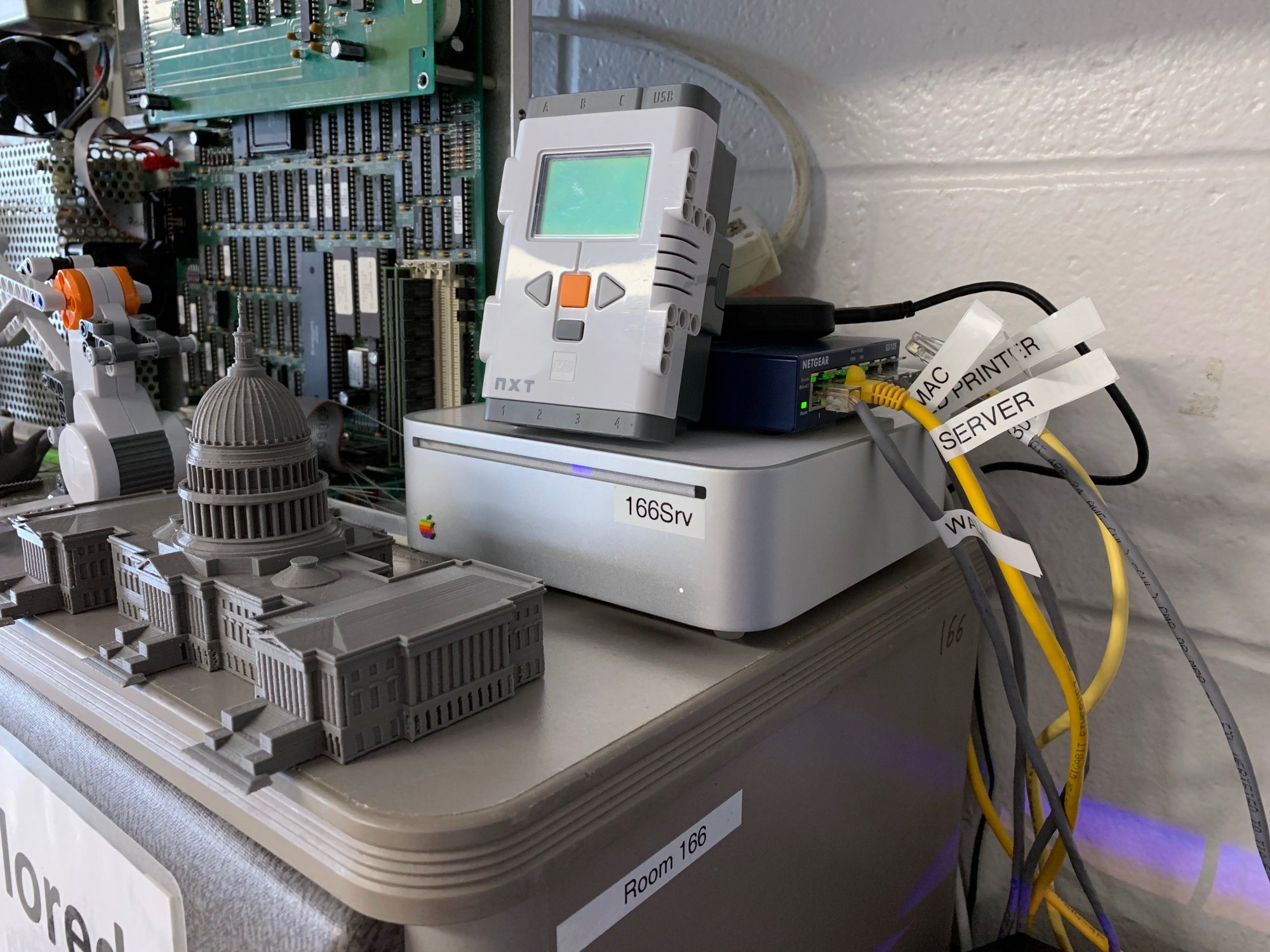Up above the two iMacs is my classroom server, a 2009 Mac mini (2.0GHz C2D, 8GB RAM, 120GB SSD). I use it for file storage, Time Machine backups for all the other Macs, and to run some legacy software, particularly my lab management software.