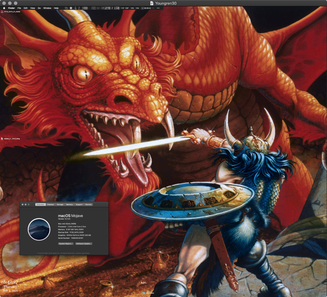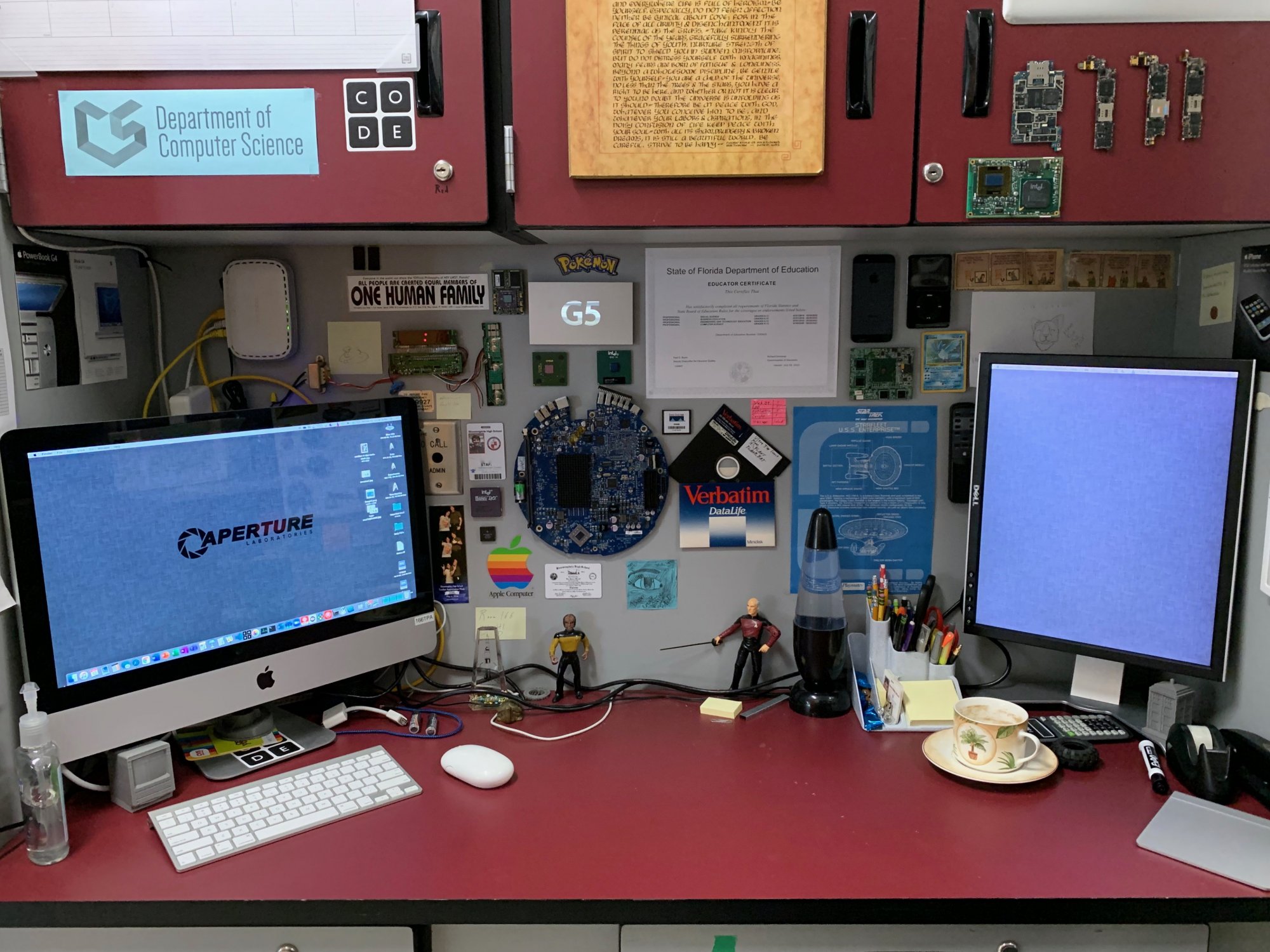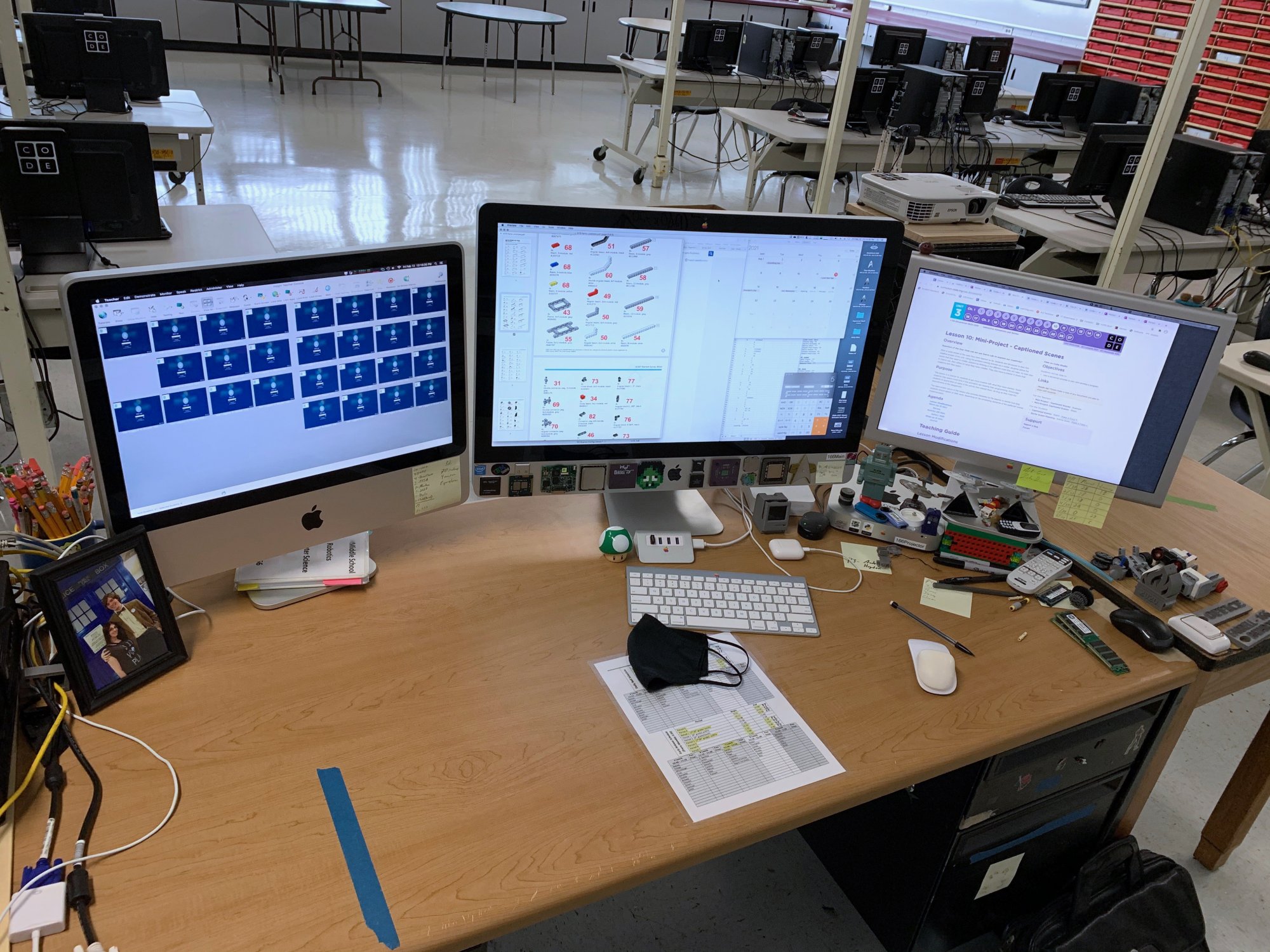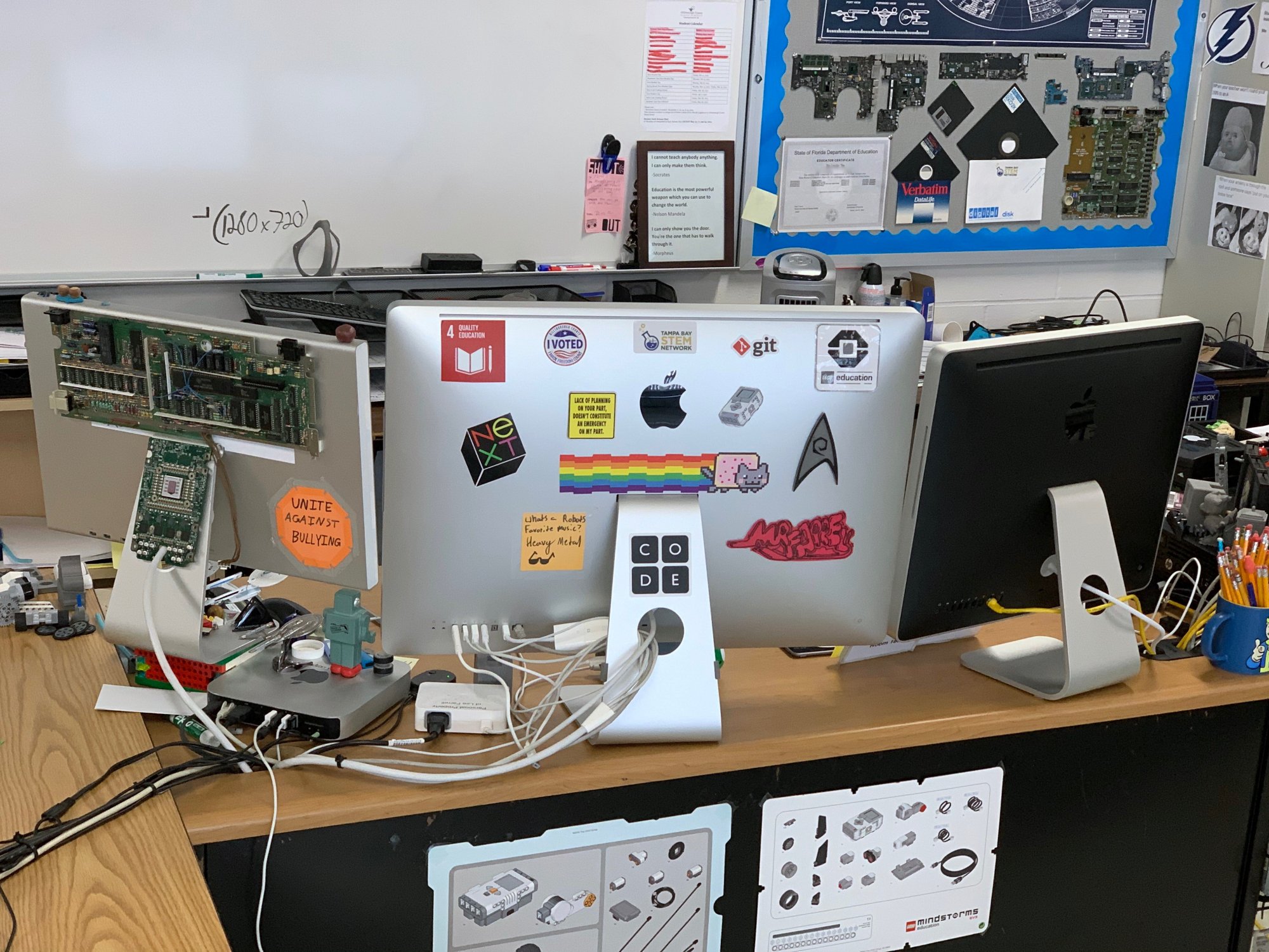 beast of a machine. I adore this computer. To its left is an early 2008 20" iMac (2.4GHz C2D, 6GB RAM, 180GB SSD) that's been in my office for the last four years as my main machine in there, though it's recently been replaced and repurposed on my desk in the main classroom as a third display for monitoring the student computers. Under the ACD to the right is a 2014 mini (2.6GHz i5, 8GB RAM, 256GB SSD) that's hooked up to the projector. I remote into it from other computers to control what goes on the projector.