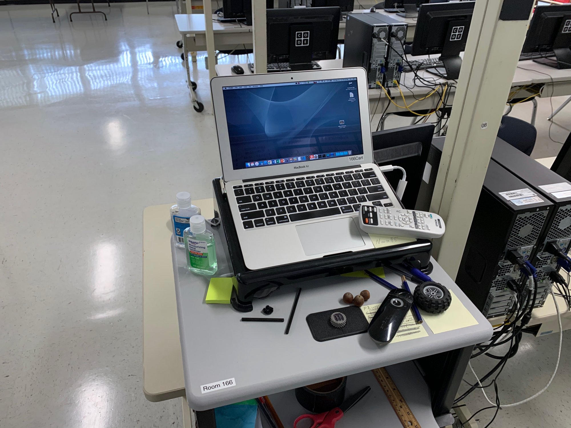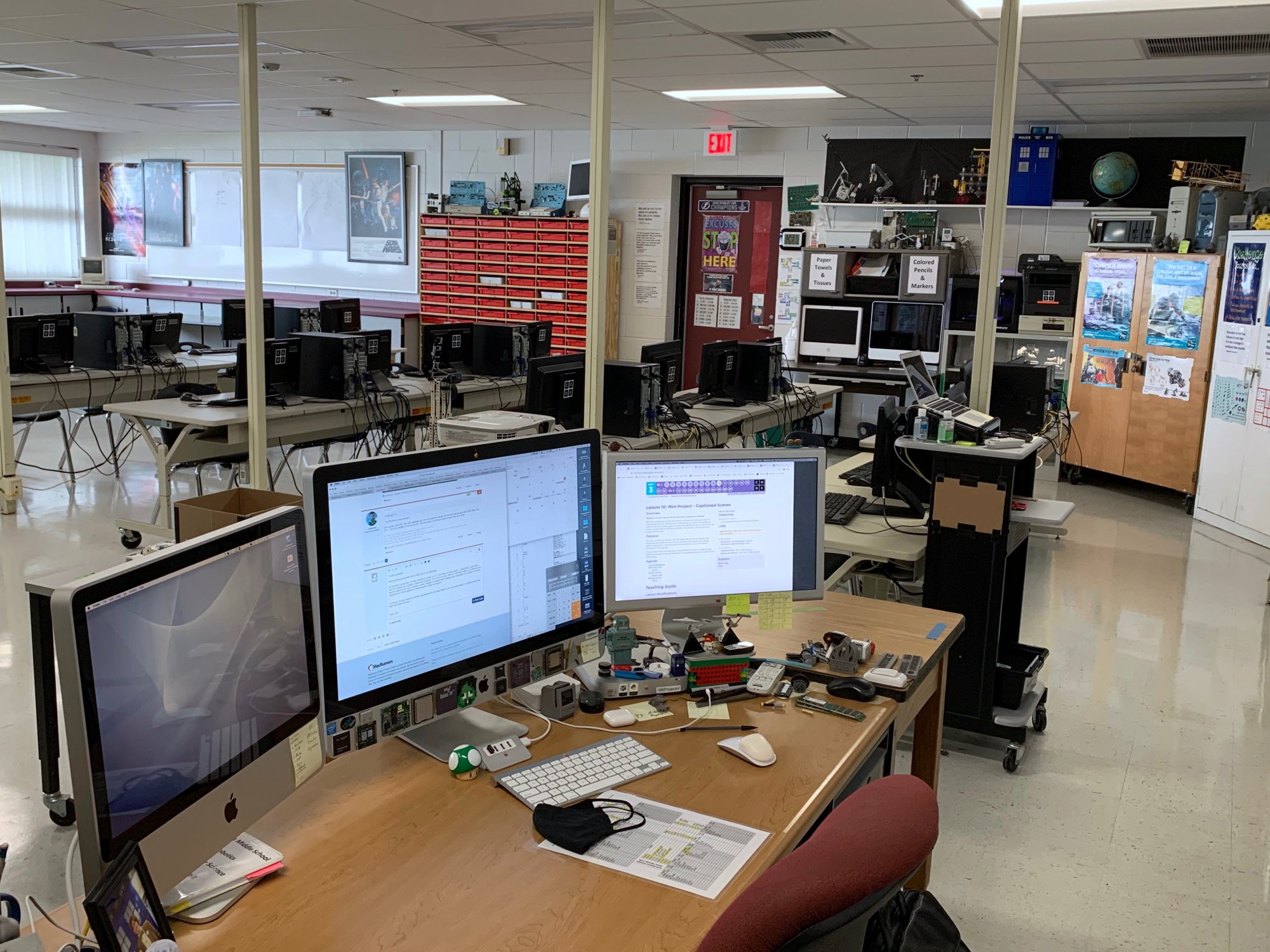 Those are the core of my production machines in my classroom! Here's a long shot where you can see my desk, the Air on its cart, and the iMacs off in the distance. I've also got a few much older machines in various stages of refurbishment scattered around my classroom