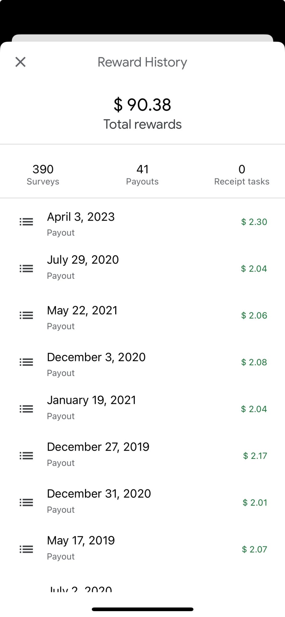 Oh yeah, me too. The surveys were often on shops you had physically visited meaning I (we!) was selling my location data to Google for a pittance. No thanks!I would get 10 cents to a dollar per survey on the iPhone google rewards app when I used it previously, maybe up to a year ago? it would despot into my PayPal when it hit $2.00.