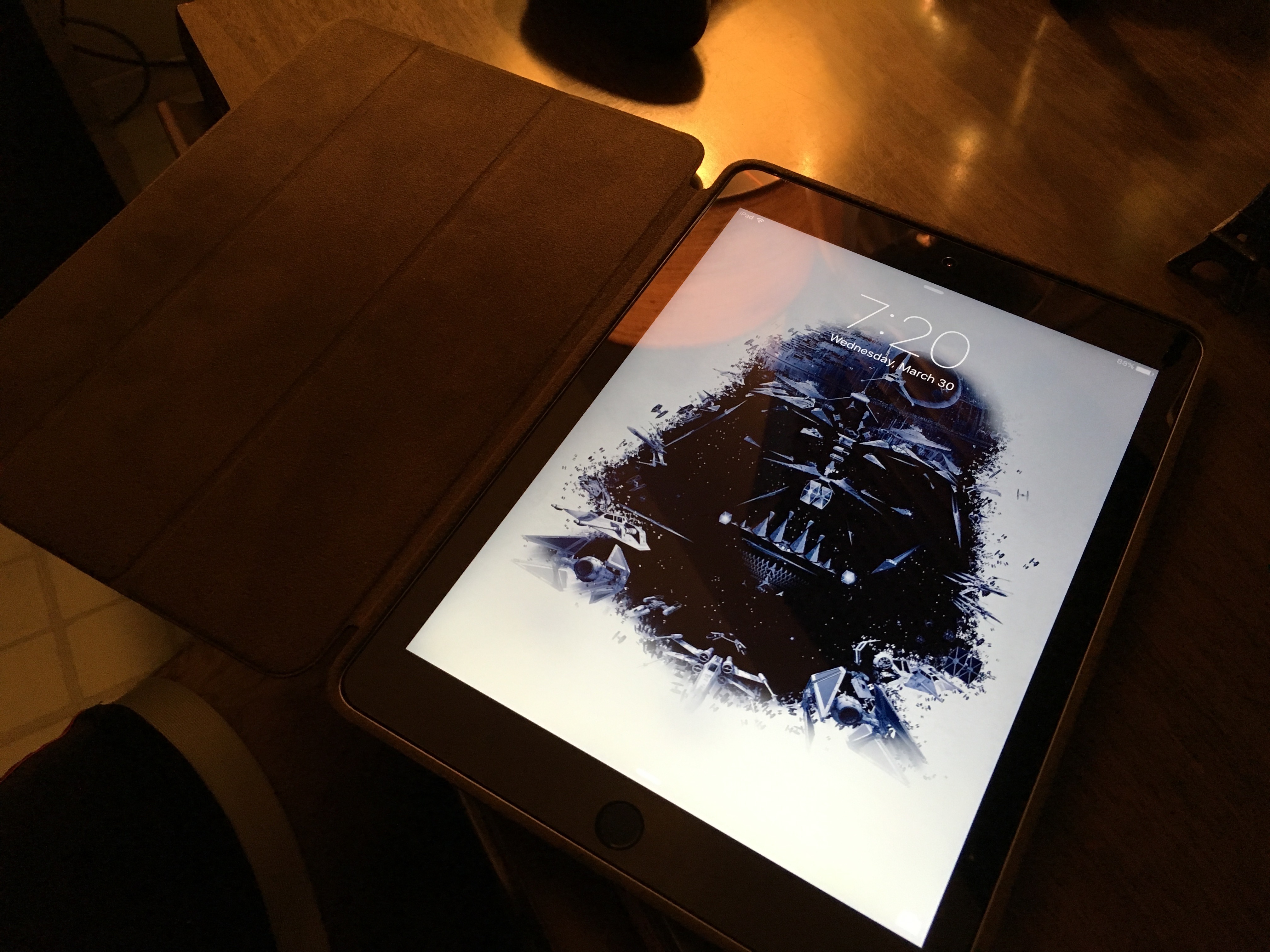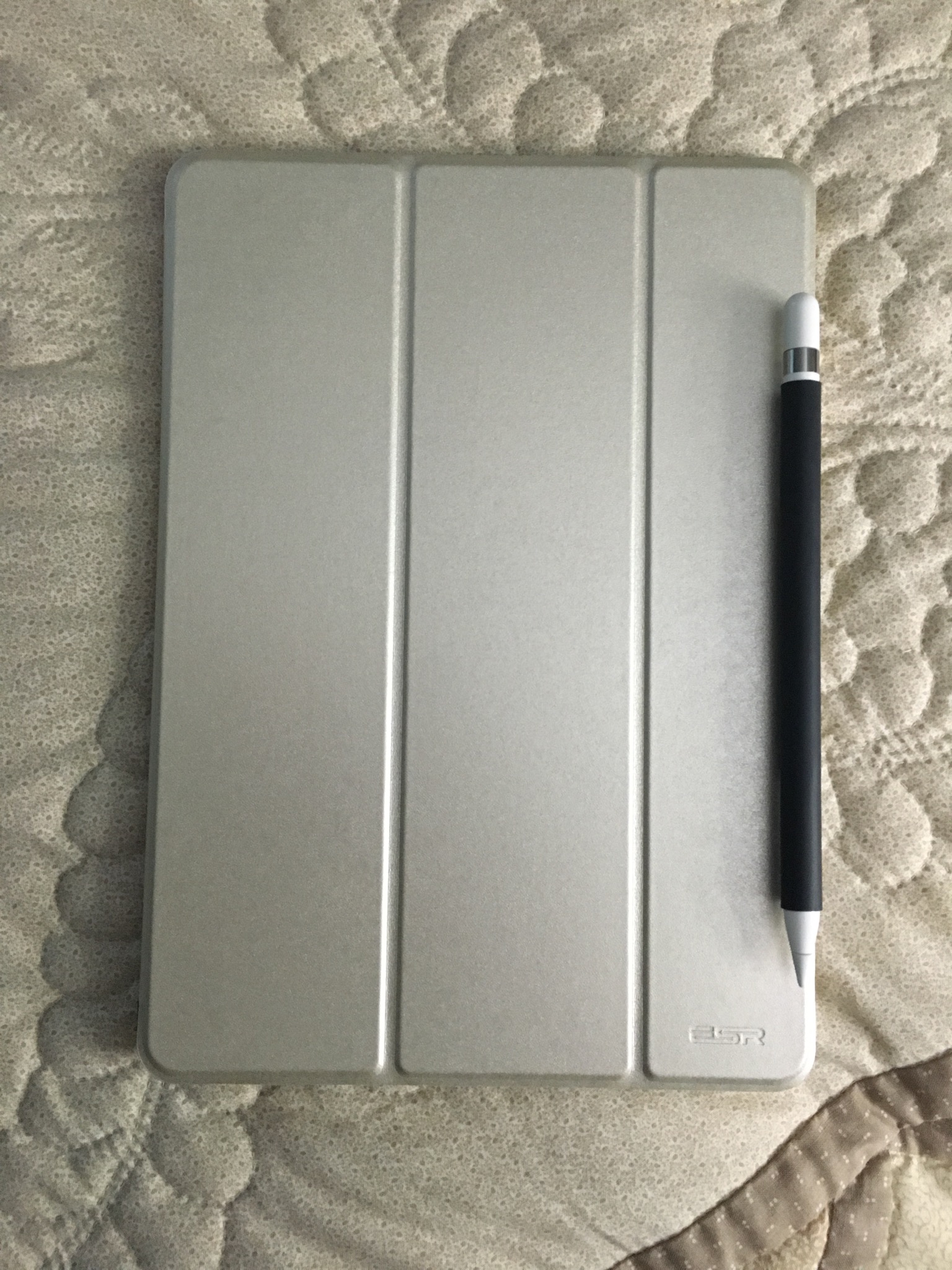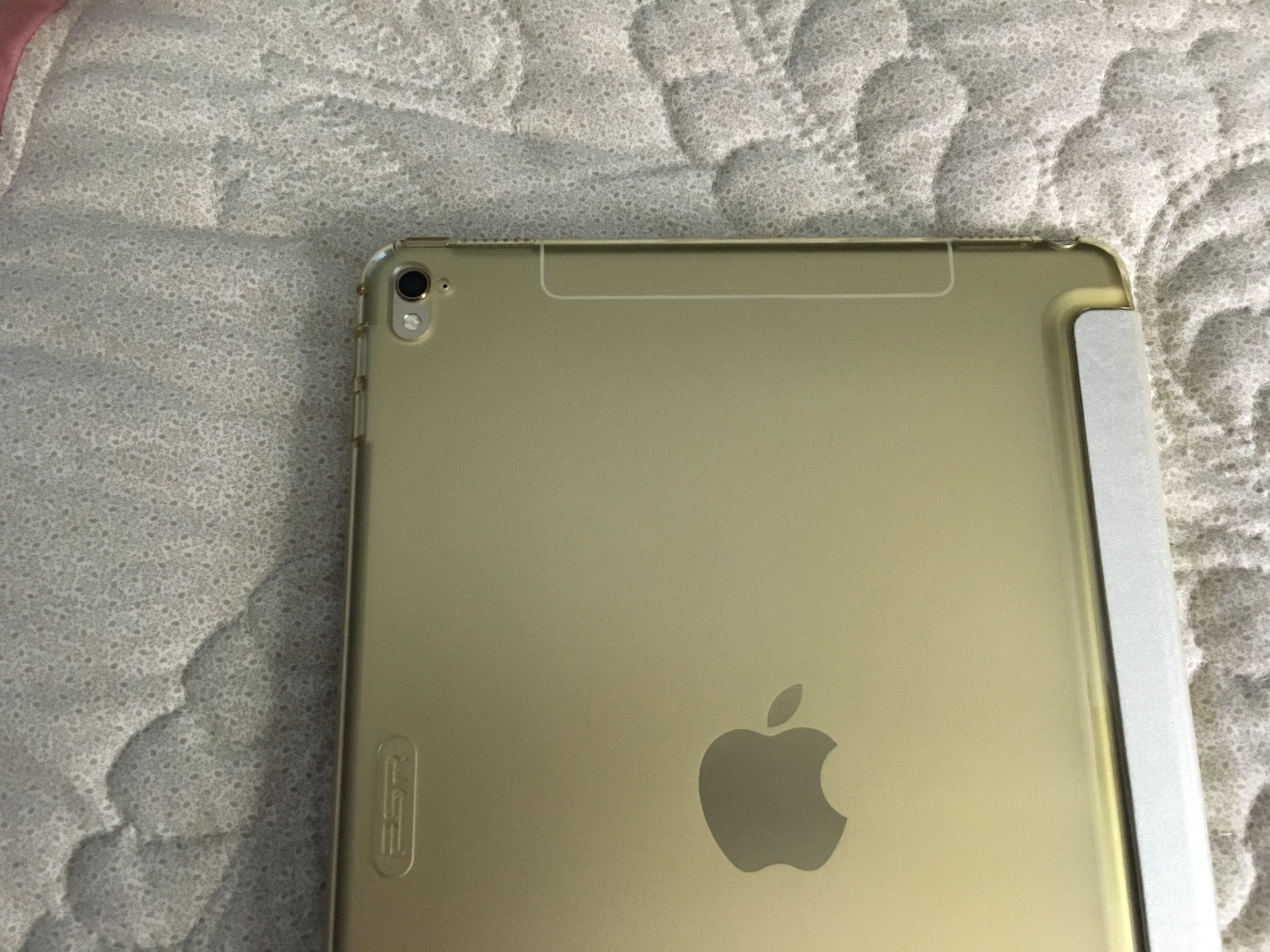 iPad Pro 9.7 temporarily fitted with a $10 case with a translucent back which shows off the gold iPad nicely.