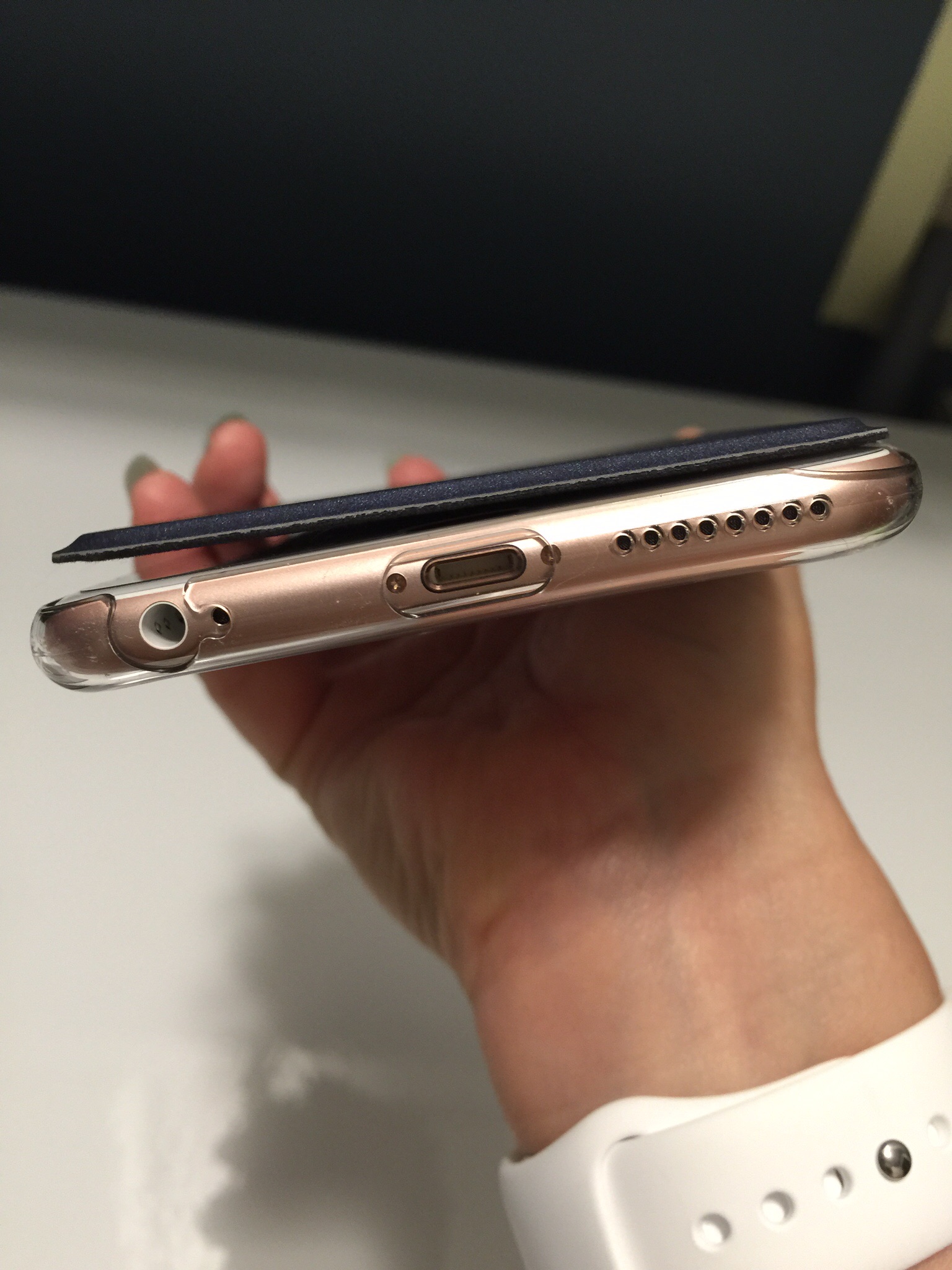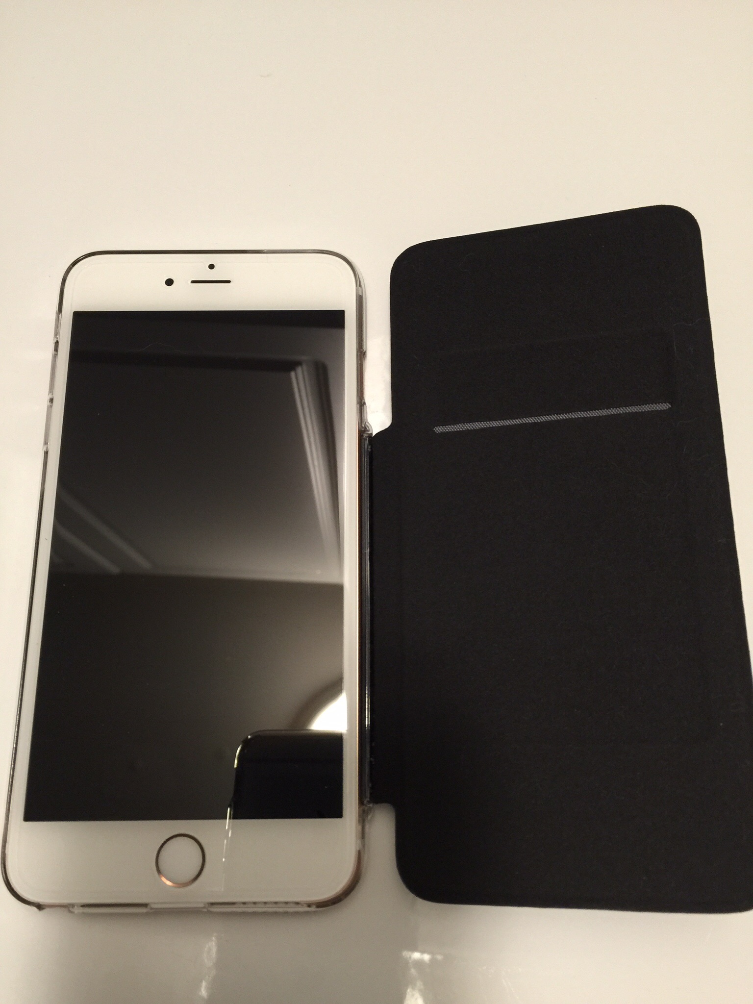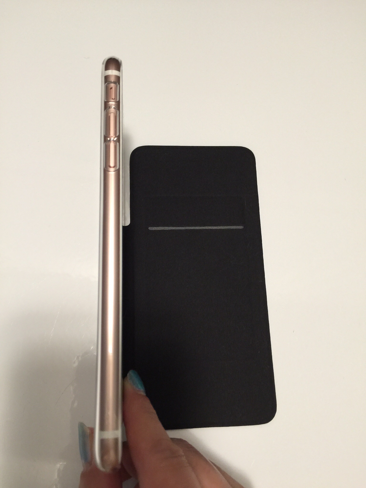 Here's a comparison with the rather beat up Incipio Highland I'd been using. The Highland (on the left) is actually my husband's. My original one did not survive the drop that shattered the screen on my iPhone 6 Plus. I don't think this case would give any drop protection either. It's mainly to protect the iPhone from scratches in my pocket and purse. I did carry a driver's license and two credit cards in the Highland. It closes with that many cards in it but there's no clasp or magnet to keep the flap on either case closed. I'm willing to put up with stuff like that. I know most people are more demanding about their wallet cases. I just wanted something clear with a cover and I'm thrilled to find out such a case exists. The lighting is poor but the blue color does look nice with the rose gold.