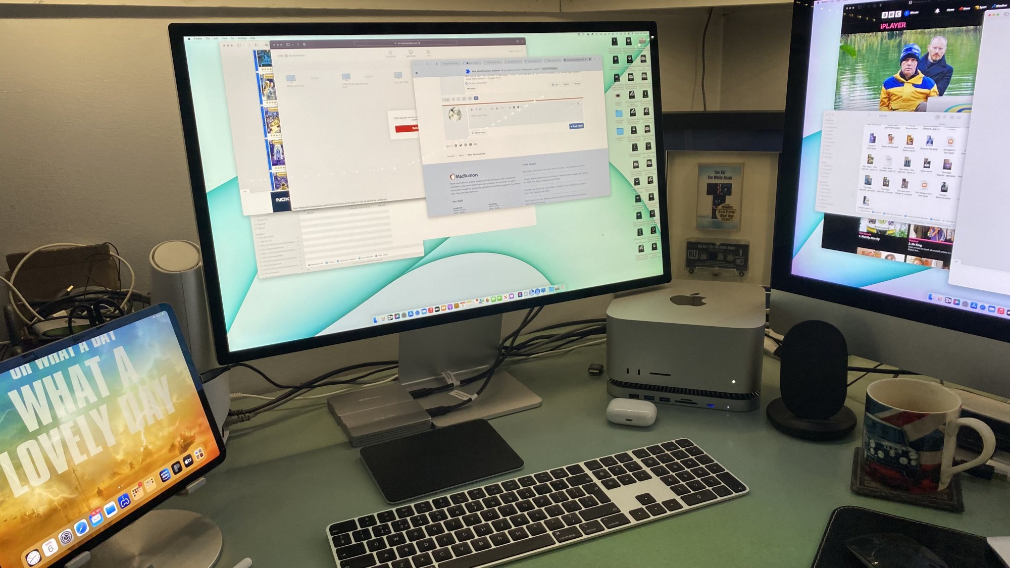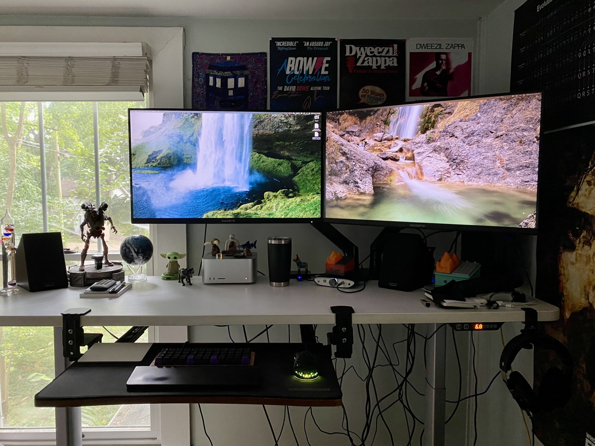 Nice setup; once the cable management is complete it will look really nice.This is still a work in progress. Still have plenty left to do like mounting power strips, network switch, PoE injectors, cleaning up the cables, and I have plans to move to a 42" C2 OLED for the Studio. I use the Logitech Flow software to go between the two Macs with two of the Logitech Bolt USB Receivers (came with the new keyboard and mouse). I didn't want to sign into the work device with my personal Apple ID in order to use Universal Control.