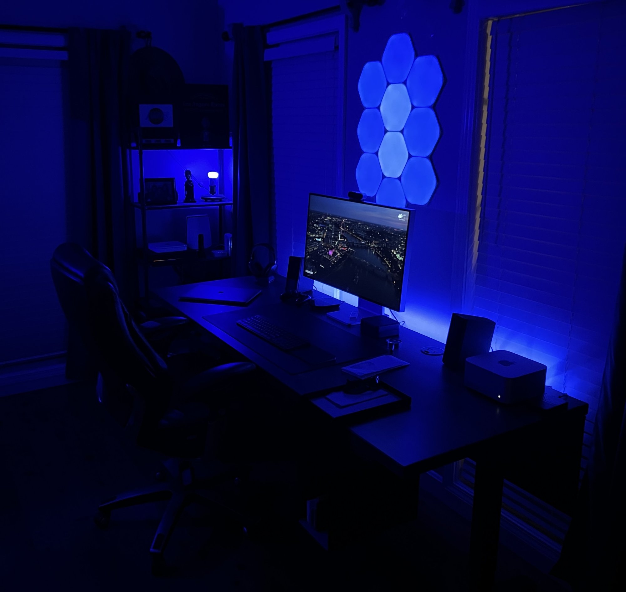 Nanoleaf hexagon and light strip lights. You can find them at Best Buy or directly from Nanoleaf.Very nice setup! What are you using exactly for the blue lightghing?