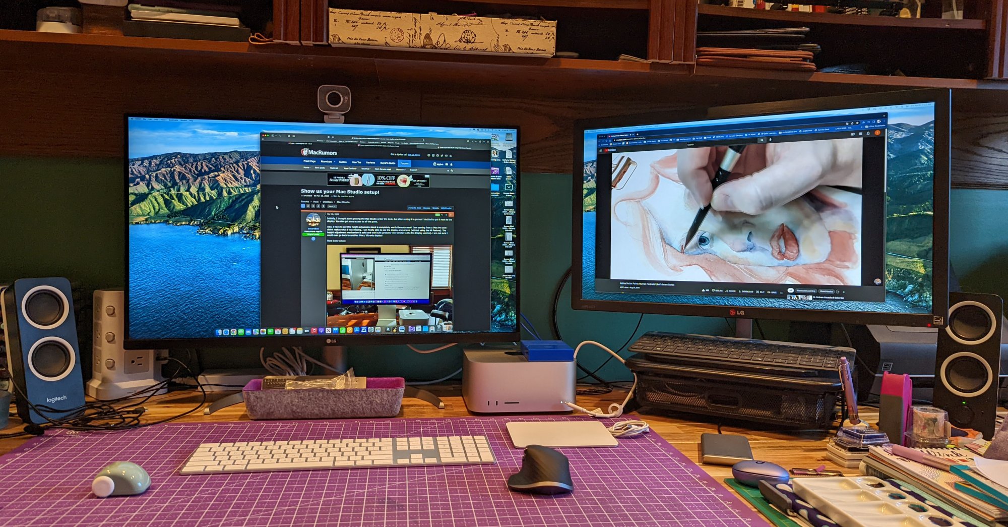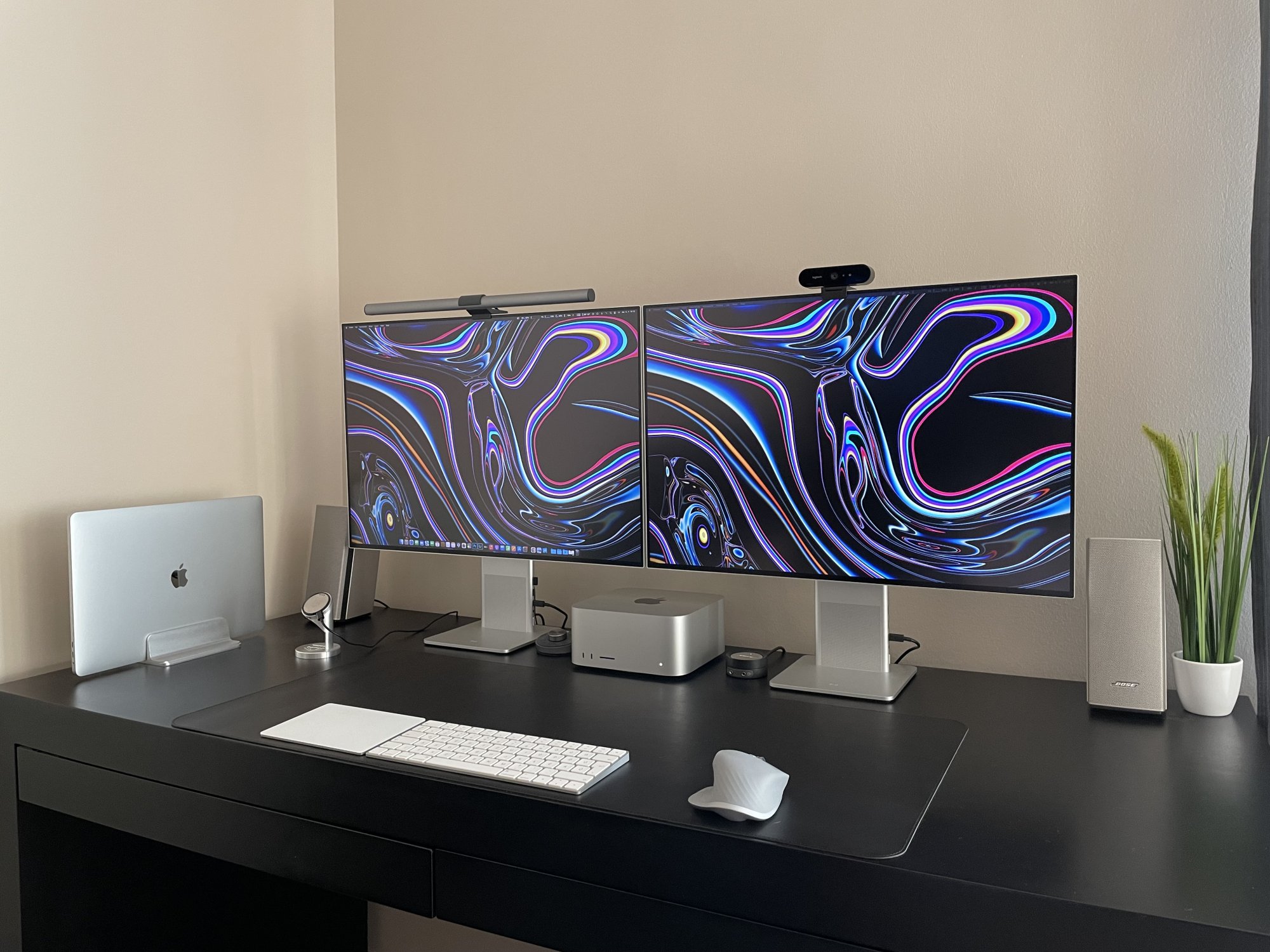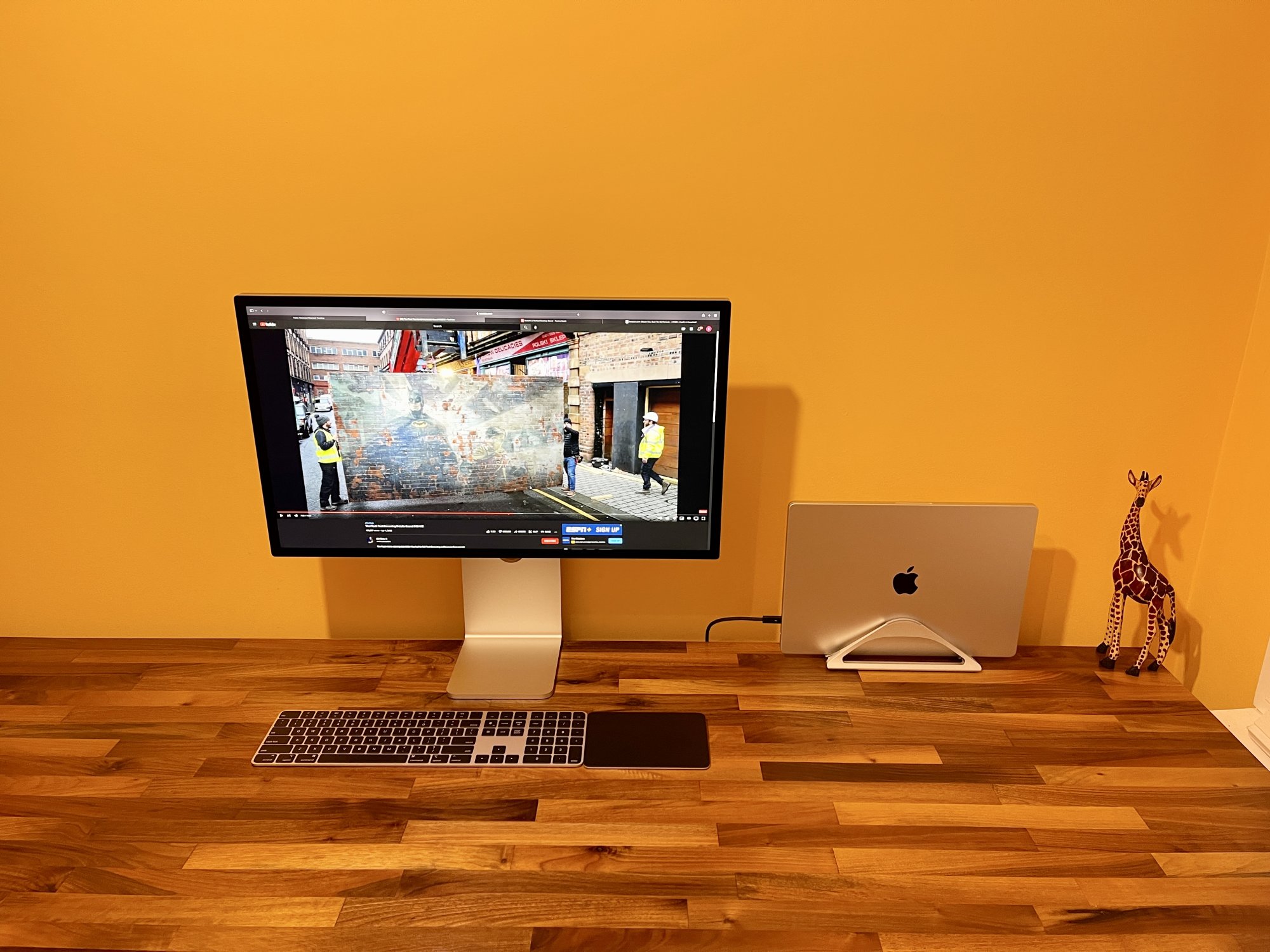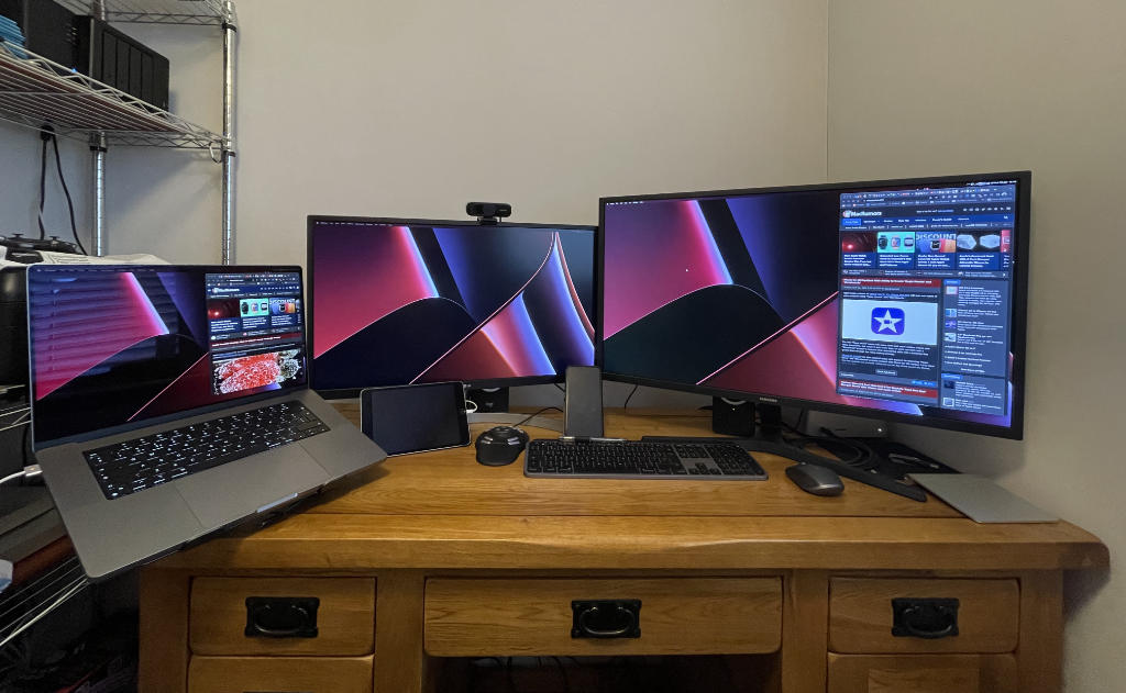 The 32" monitor on the left is connected via USB-c (not a thunderbolt supported monitor) and the monitor on the right (which is a fairly old regular old HD monitor) is attached via HDMI.
