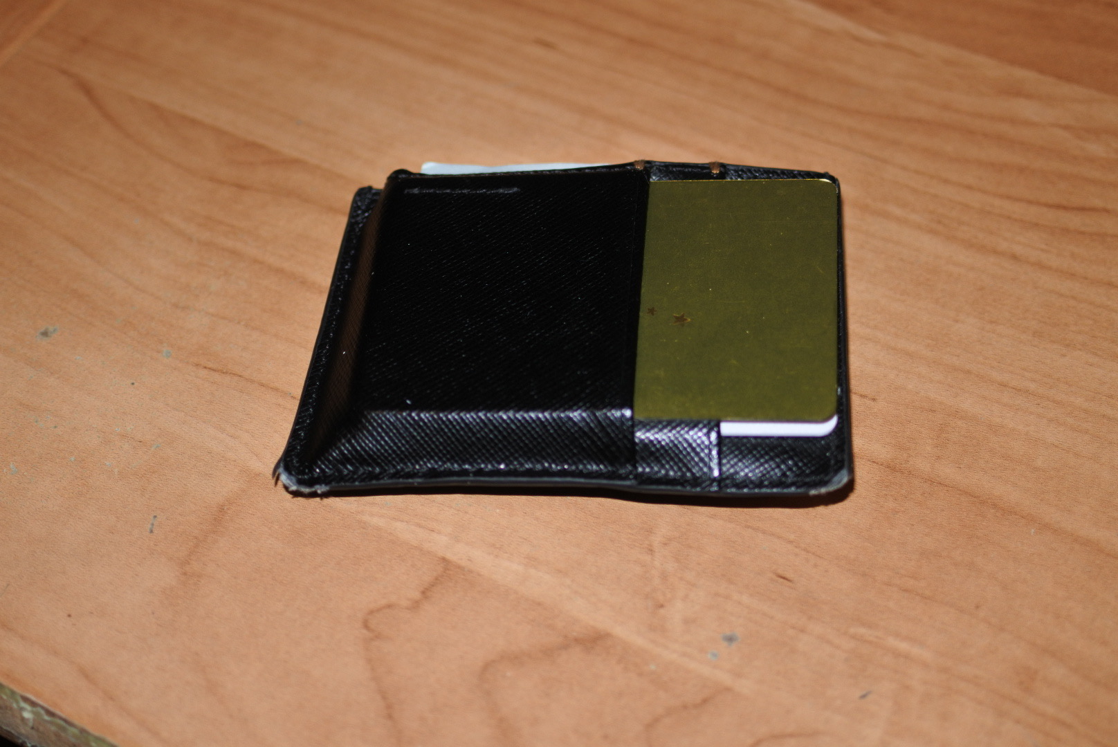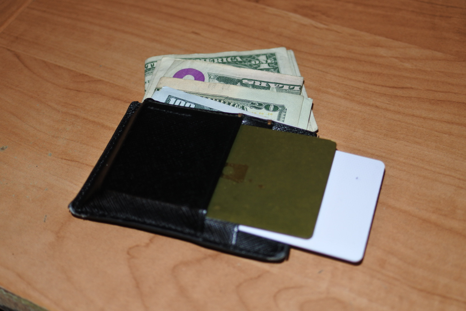 Refyne CC1 is my usual carry. It has a multitool and a small "tooth"pick in its outermost slot. Two more multi-card slots on one side, I keep three ID cards, four credit/debit cards (same as above, plus personal credit and personal HSA debit cards,) back side contains two multi-card pockets that contain my work RFID badge card, my car's RFID "key"card, plus a variety of membership type cards that can't be loaded into Apple Wallet yet. (Right now there's a library card, a local chain "membership warehouse" membership card, and two "frequent buyer punch cards", and an organization membership card that is good for discounts at a variety of stores.) Center between the two sides is room for cash folded in half. This one when empty is about the same thickness as the above, but I have it rather overstuffed, and it doesn't seem like it's going to fall apart any time soon. Even completely full, (with 15 bills the center at the moment,) it's only about 20mm, just under 1" thick.