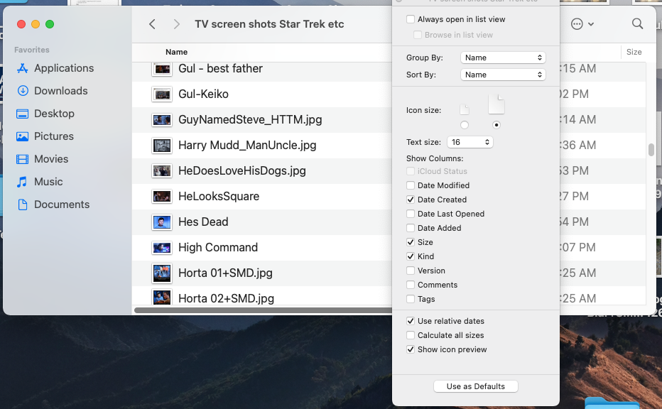 When trying to enlarge the thumbnails of jpegs, some of my folders have an option of the slider to make them bigger or smaller. SOME of the folders, like this one, ONLY have the choice of Two Sizes for the icon. (screenshot). I only recently went up to Big Sur, from Catalina. I don't recall this happening in Catalina, but maybe it did. Is there some setting on that individual folder that would mess with the view options? I've gone to a different folder that Does have the slider option, and clicked on 'use as default' but I guess that doesn't apply to All photo folders? View>Show View Options
