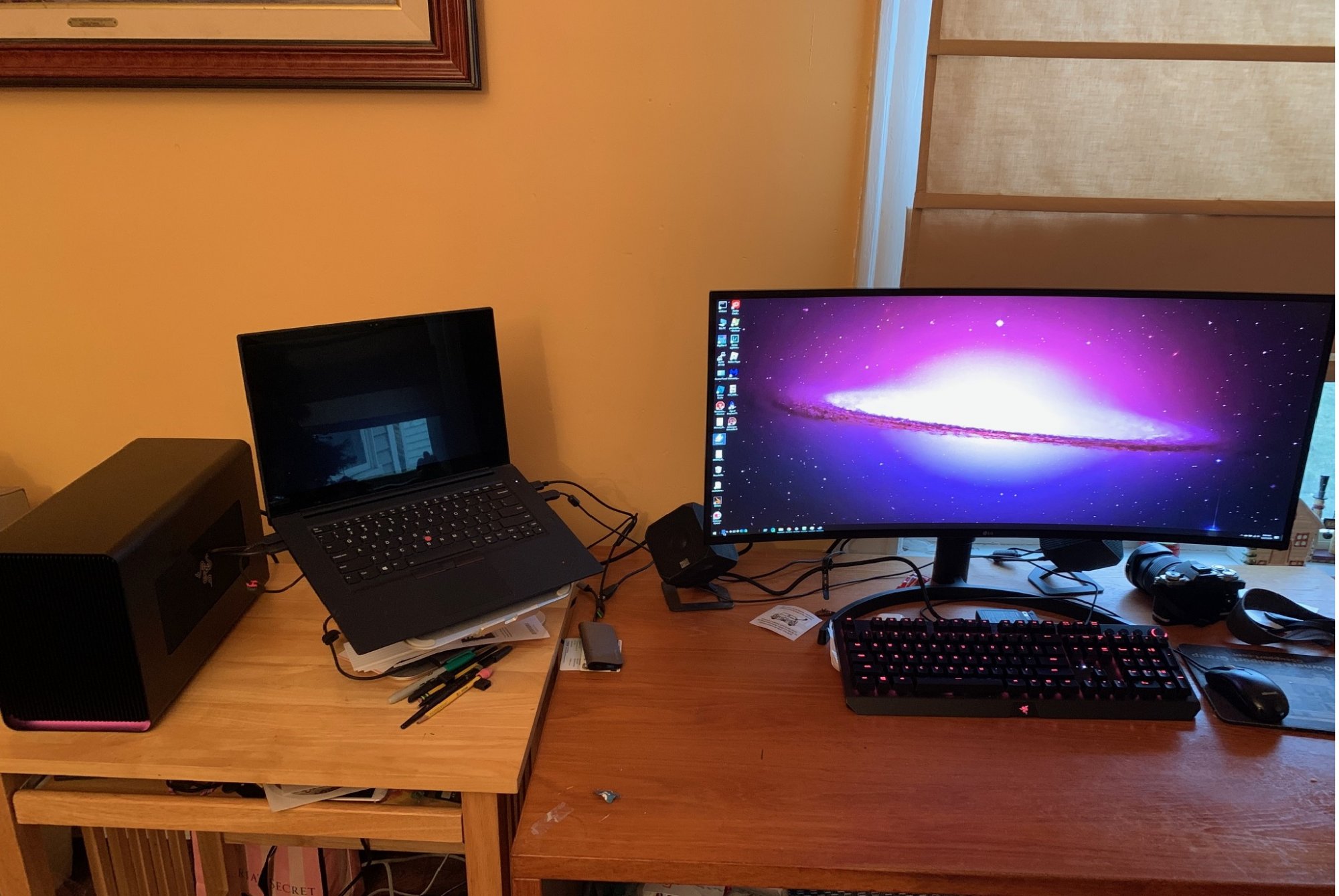 Lenovo Thinkpad X1E (gen 1), Razer Core X chroma (with a RTX 2060 Super) and a LG ultrawide. Overall I was surprised at how fast the thinkpad's 1050-ti was - my expectations were rock bottom I guess, but the Razer Core X with the RTX Super blows the doors off