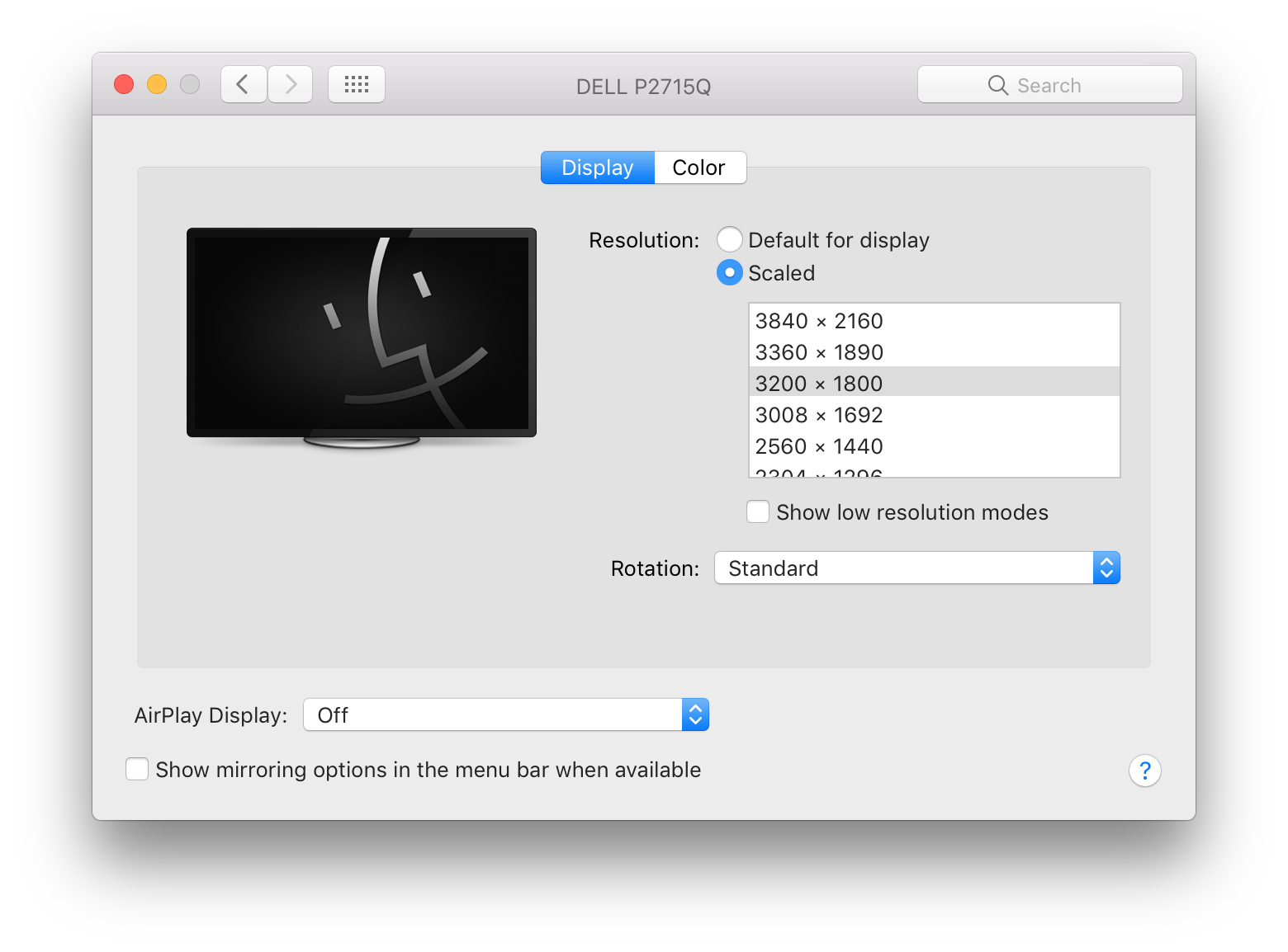 However, if I set the resolution to anything other than native 1440p (which is too small for me at 25") it simply lowers the resolution, not offering the usual HiDPI modes. What I would like to do is have 1440p resolution output at 1080p (or close to) scaling.