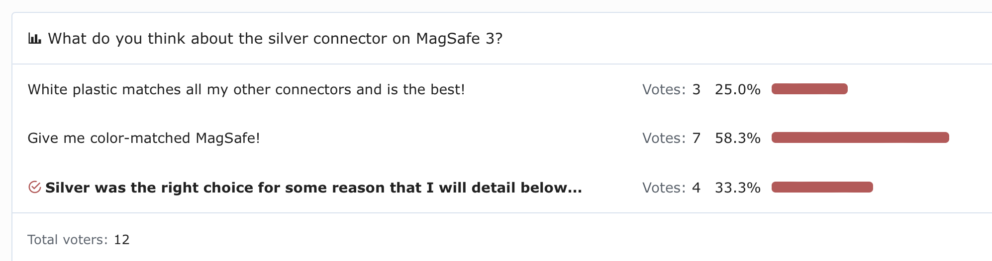 Is this a case where the designers wanted two SKUs for magsafe connectors in silver and space grey, but operations won out and veto'd it? Is this just a way to get everyone to buy a space grey cable next year for another $49? Will this usher in the era of Apple Cable Subscription where you get a new magsafe cable in seasonal colors twice a year for $99? Or is this a case of aluminum just being the right material because of the way the steel connector and pogo pins are integrated? Even then, this design was delayed from a Summer release, surely they had time to annodize a few magsafe connectors in space grey while they were waiting for chip deliveries? The iMac Pro got new SKUs for all the color matched accessories, why don't the MacBook Pros get the same treatment?