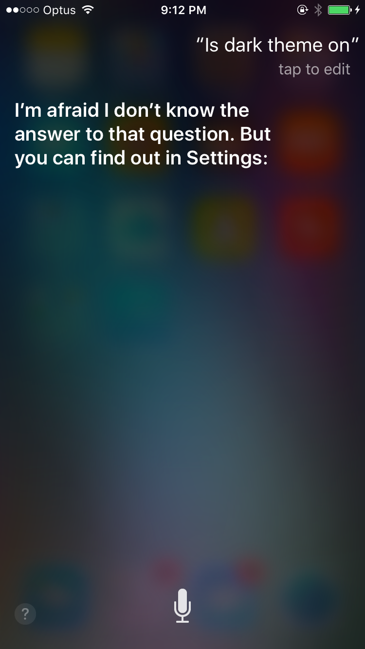 With all the rumours going around about a 'Dark Mode' in iOS 10; I thought I'd see if Siri knows anything about the 'Dark Mode' in iOS 10. So I asked here to 'Enable Dark Mode' and she said 'Sorry I can't change that setting' - she seems to have successfully recognised it as a setting!