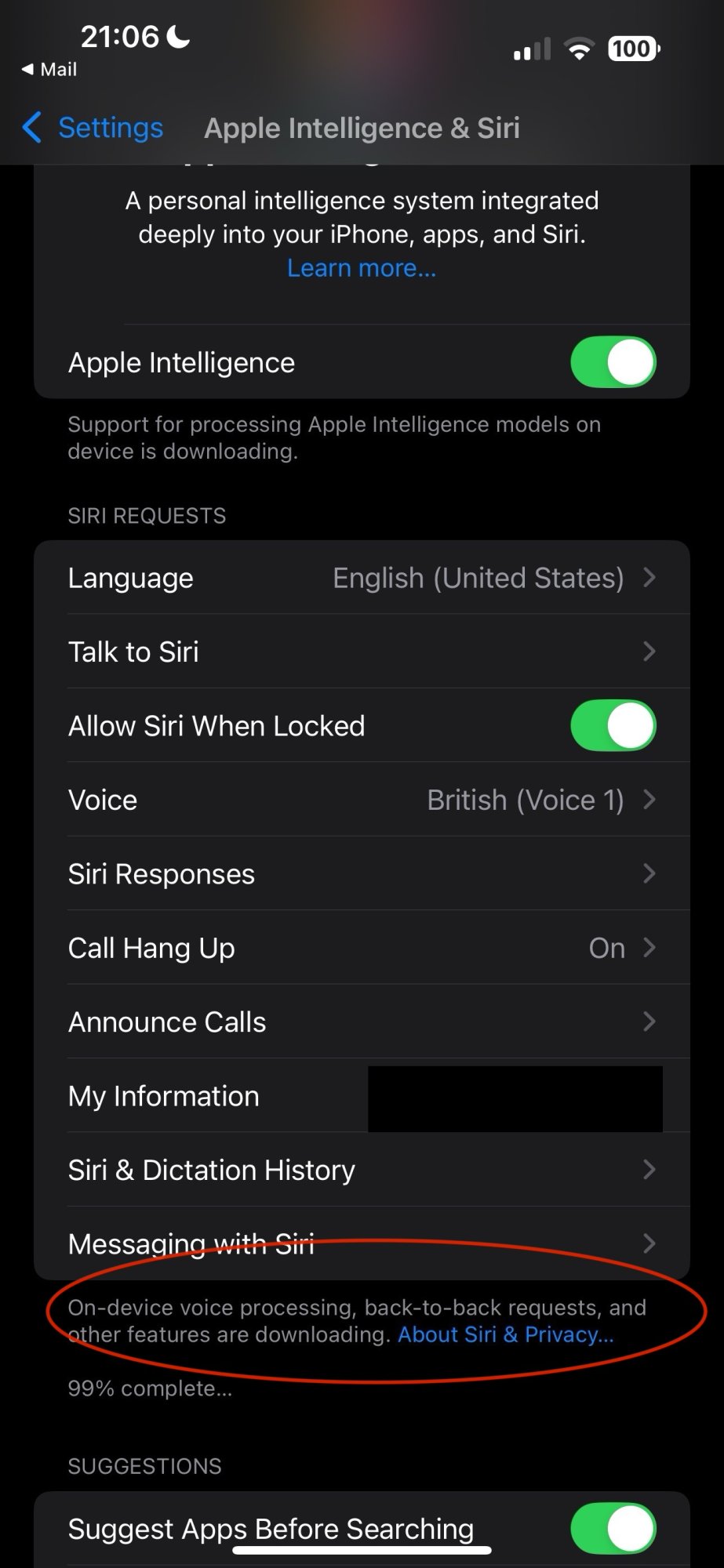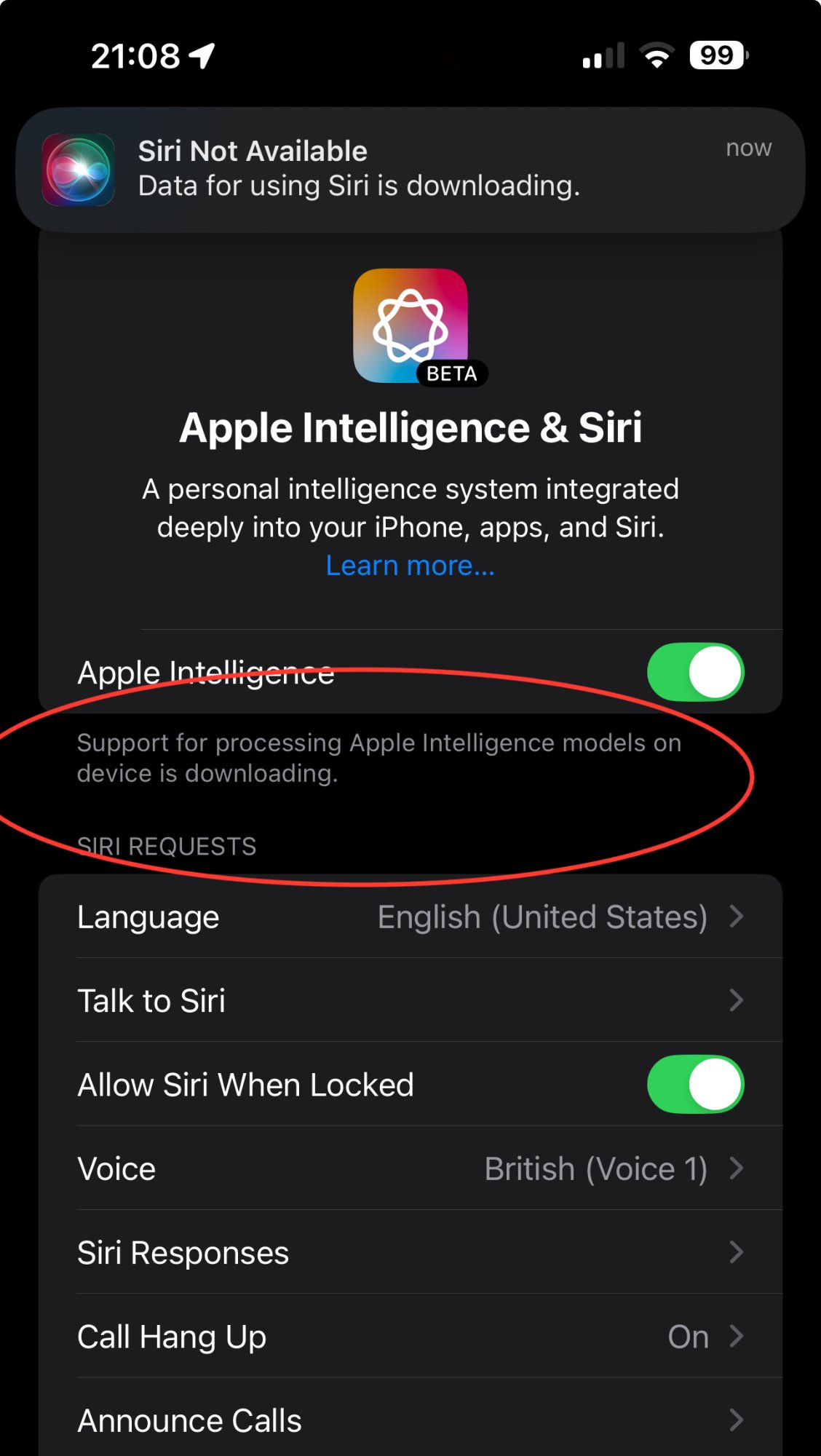 The banner says that "Data for Siri is downloading" or that users need to "Connect to Wi-Fi to complete Siri download." Either way, no download completes as it seems to get stuck at 99 percent, and Siri remains unavailable.