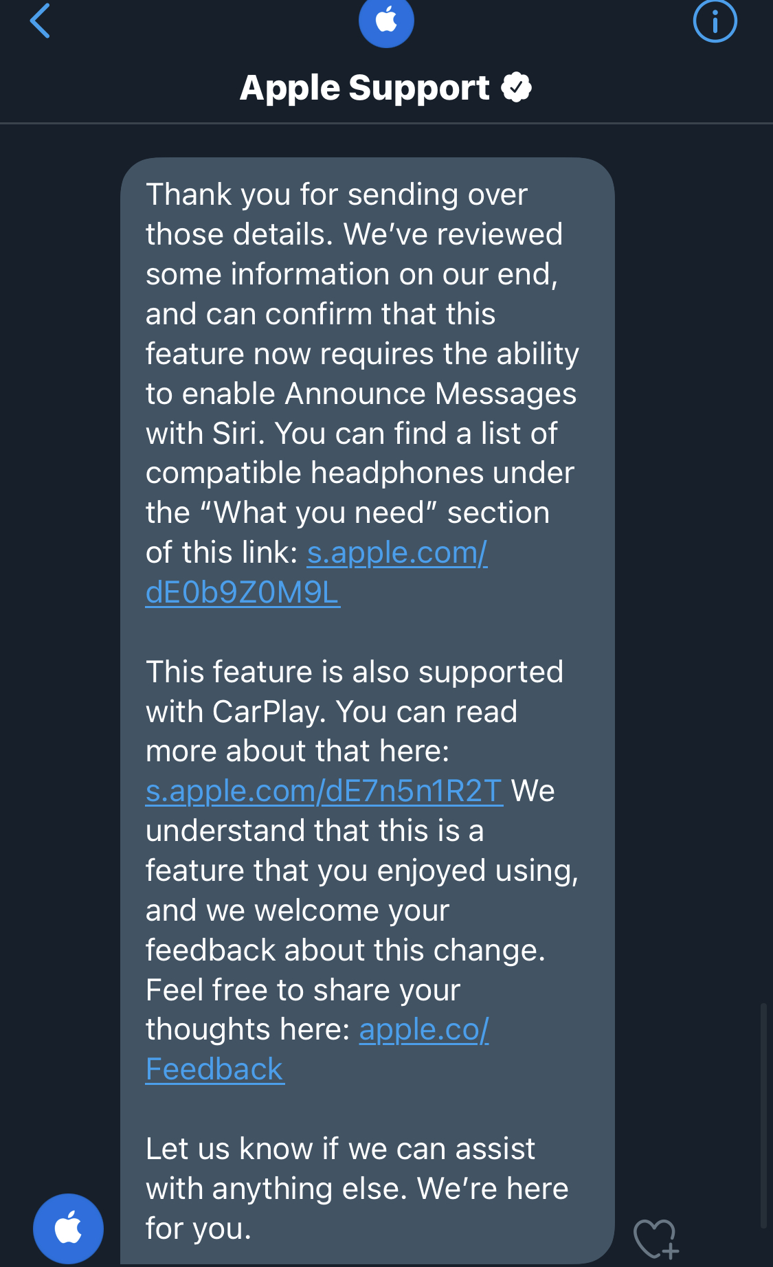 So Apple is saying it will only work with particular headphones and CarPlay now? And would only work just when the message comes in and gets automatically read at that point (since that seems to be how that announce feature works)?Got this response from Apple Support today. View attachment 966720