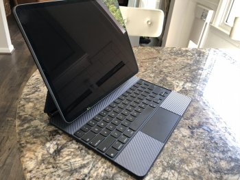 Here are some pics of my gunmetal carbon sophiguard skin. Installation was a breeze; I did use a hair dryer on the edges for piece of mind but not sure it was really needed. Decided not to install the trackpad skin as I like the smooth glass feel.