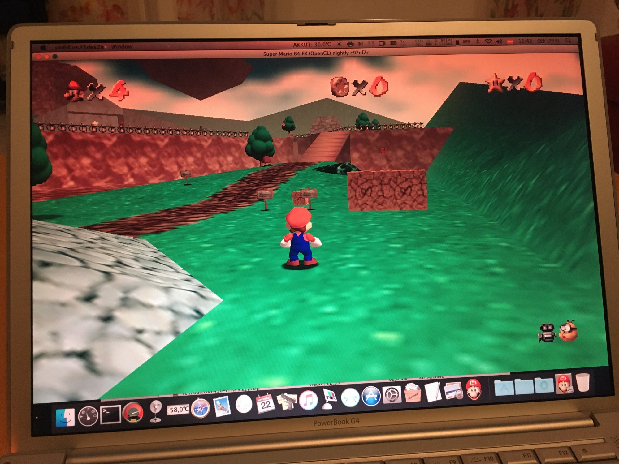 Then, download my sm64ex fork (I recommend the master branch). Copy your sm64 rom into the fork's directory (I've tested the Japan and the USA ROM). Name it either 'baserom.us.z64' for USA or 'baserom.jp.z64' for Japan. Cd into the fork's directory, and then execute 'gmake PPC_OSX_BUILD=1'.