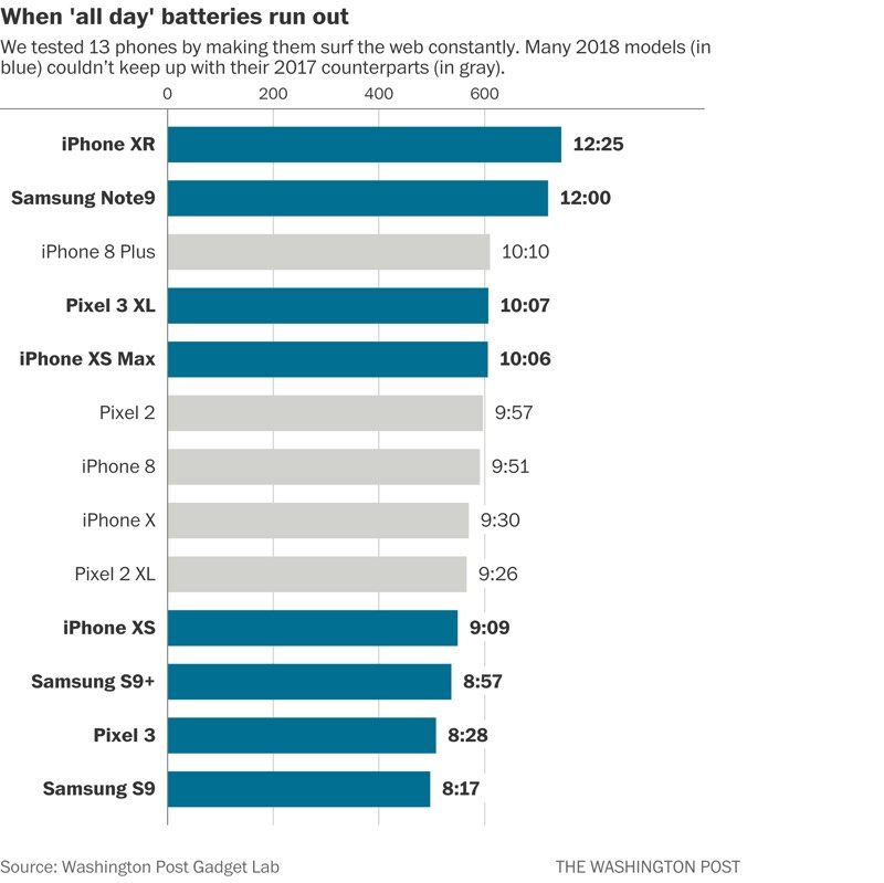 Nadim Maluf, CEO of battery optimization firm Qnovo, told The Washington Post that batteries improve at about "5 percent per year" but smartphone power consumption is growing faster than that.Apple's iPhone XR, the new phone I recommend to most people, has a different approach. It scales back on the screen tech -- lower resolution, less bright and lower-quality color -- in ways that benefit battery life tremendously: The XR lasted 3 hours longer than the top iPhone XS, even though the its screen is actually a smidge larger. (Bonus: It also costs $250 less.)