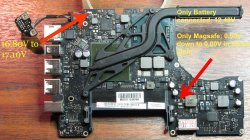 With only battery connected i measured about 12.48V at the incoming pad of where the Fuse normally is soldered to. When disconnect the Battery and connect the magsafe i measure about 0.50V, going slowly down to 0.00V when holding the test probes for about 2min at the solderpad.