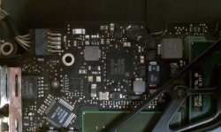 The charging controller on the 13" and 15" unibody model is a ISL6258A part. Not certain about 17" but I would guess it is the same. I think I posted a data sheet link earlier in this thread. That will be your starting point. It is a 28 pin QFN package so 7 solder pads each side. It communicates with the SMC to activate charging and then uses a push-pull FET circuit driving an LC network to generate the charging voltage. There is a current sensing resistor (the green device) that feeds back the charging current information to the 6258. Check those FETs to make sure they haven't shorted and check the components around the ISL6258 to make sure none of them are badly corroded.
