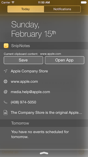 Imagine, you are searching the internet for a new job and want to note contact information about potential employers. With SnipNotes you don’t even need to close your browser to do that. Simply copy the text into clipboard, pull down notification center and tap on the big „Save“ button. Later when you need the information again, tap on the saved entry and the text will return to your clipboard, so you can use it in another app.