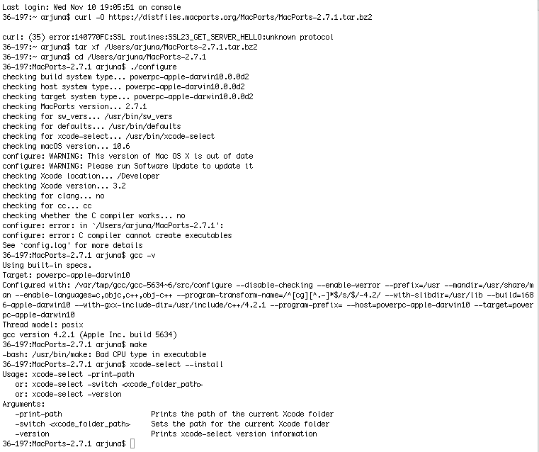 It says the C compiler isn’t working but that’s not very useful - perhaps use ‘file’ on the binaries inside the Developer Tools and see what architectures they’re compiled for? It does look as though ‘make’ is intel on your system now. If GCC has been compiled for PowerPC then we can use it as a replacement for the earlier version, even without the rest of the IDE. I may have a look through the 10A432 version for later builds too actually, it’s something I hadn’t considered doing until now.As of now I am unsure gcc is functional. I tried to build macports on that system with Xcode from 10A261, and it fails: