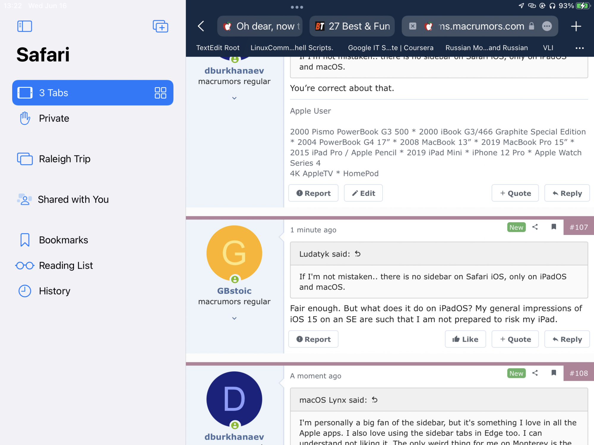 It is easy for tabs to get lost and really looked smushed and kinda sloppy on the ipad mini. But my experience hasn't been great in Monterey either. I don't understand how it's a great implementation for the desktop. But overall I like the iOS implementation. I don't like the sidebar, but I've never liked sidebar UI elements since I saw my first one in Netscape 7. They are just large, clumsy, space-wasters. I'd like to get a new tab button back on the bottom that can be opened with a thumb tap but also where private browsing can be invoked right there with a tap at the same place.Having spent more time with it - I’n kinda iffy on how the top and bottom attempt to color match with websites. It rarely works out well. But then at the same time when you turn color matching off the UI looks a bit awkward with the status bar. I wish they would have true full screen option iOS where time and status icons hide and the screen just is one continuous webpage. Other than that I’m still really enjoying it on iOS 15 and Monterey. Overall a meh experience on iPad mini however. I think the screen is too small for the iPad design to be effective (specifically tabs/address bar).