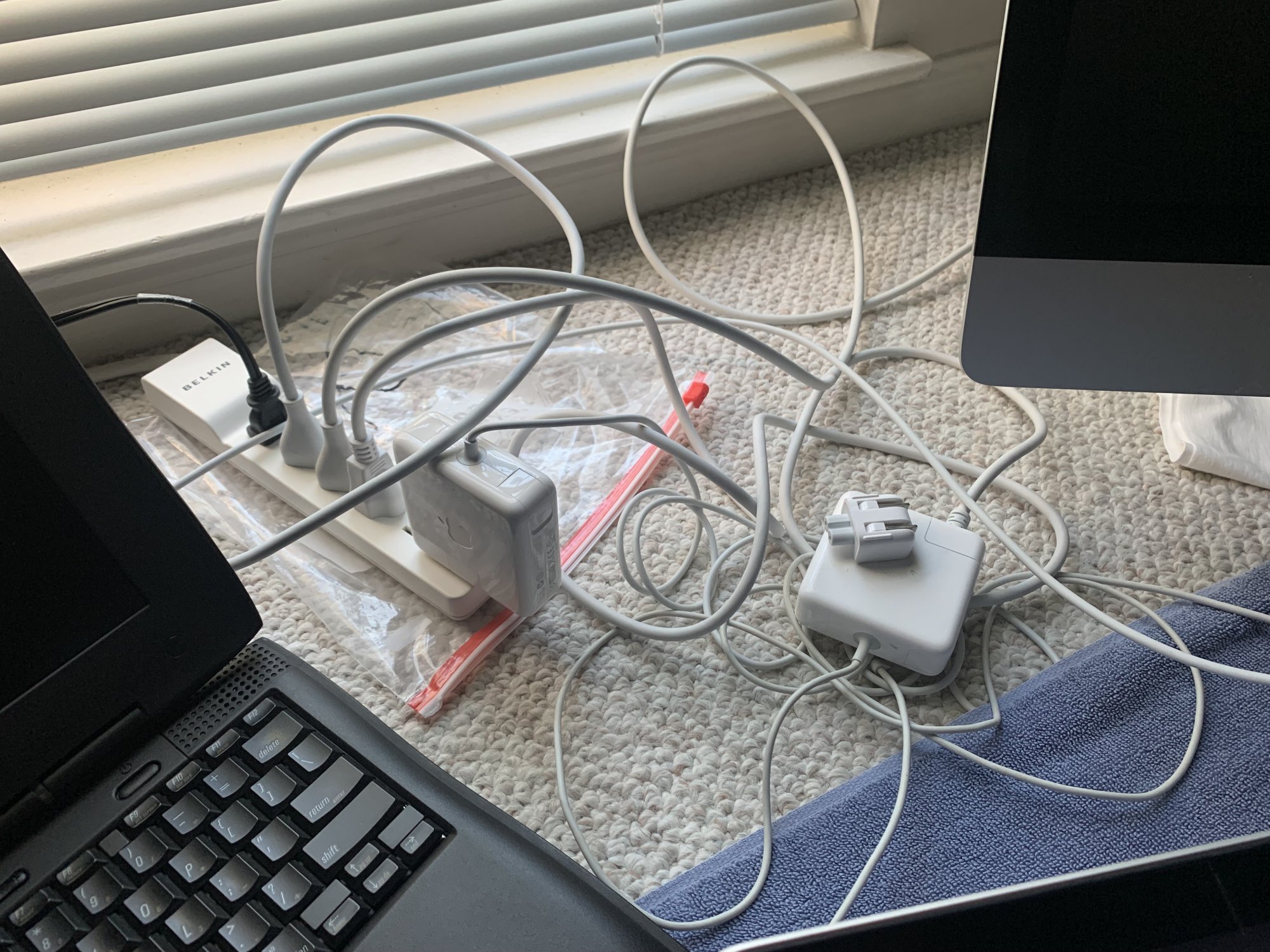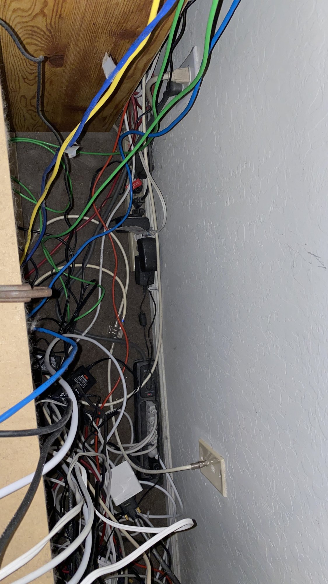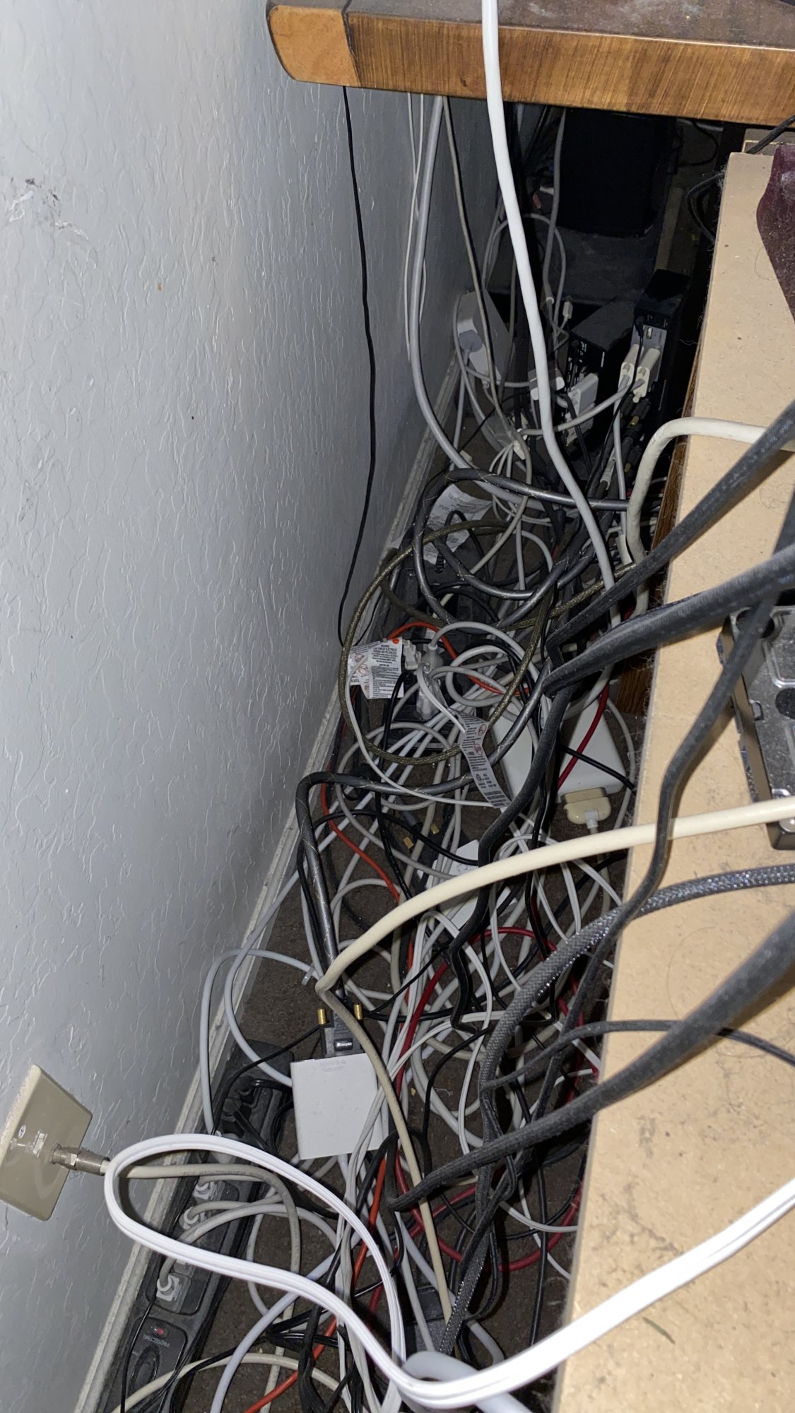 So, yeah, four occupied plugs on the wall with four power strips and a fifth powerstrip that goes to a plug in the kitchen.