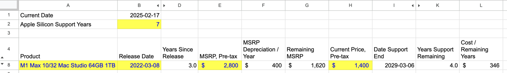 Assuming 7 years of total support for an Apple Silicon Mac, this machine's depreciated value (straight line) is $1620 as of today, so buying at $1400 means you're getting about a 14% discount, not 50%. "Half the original" IMO is not the right way of looking at it.