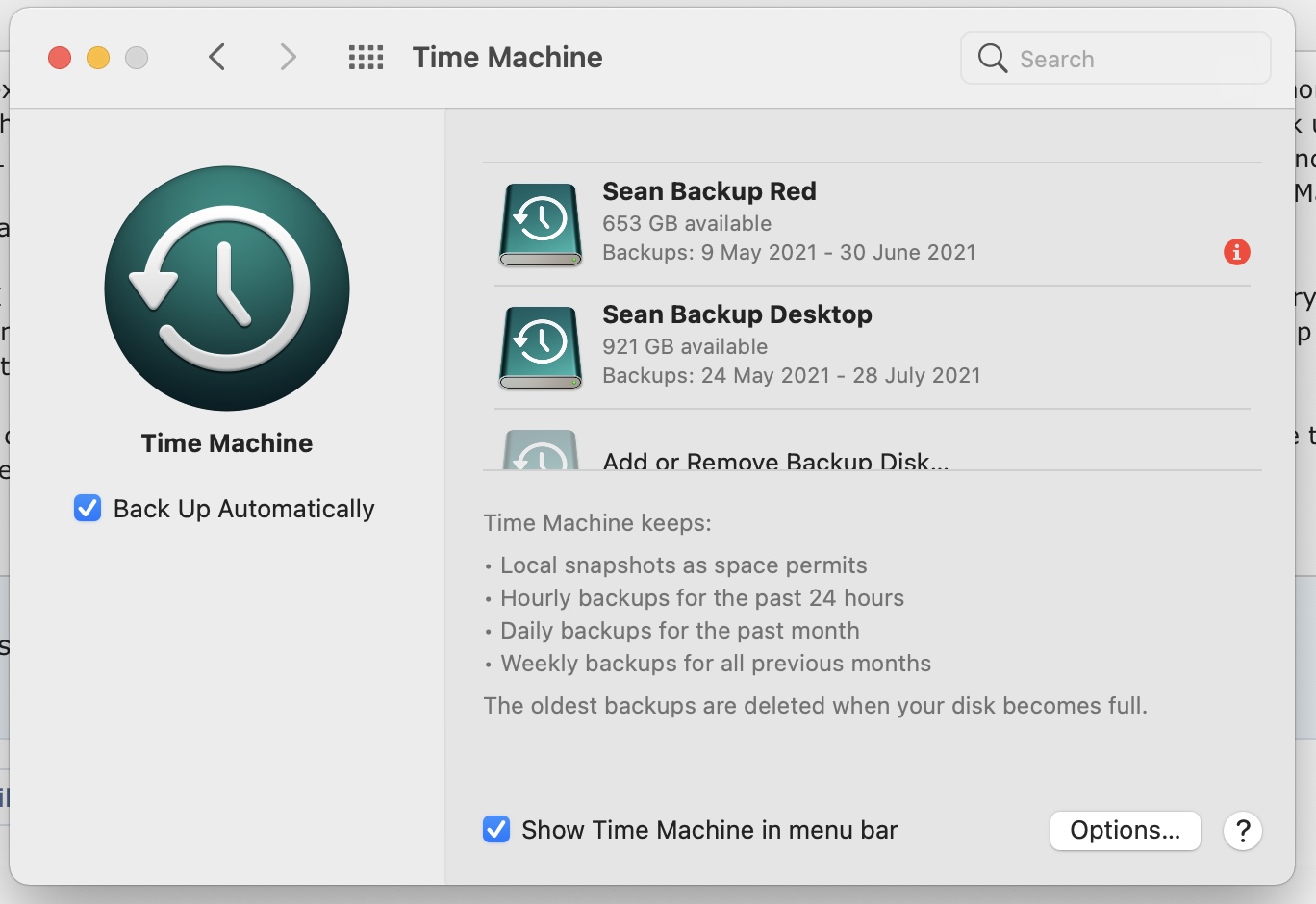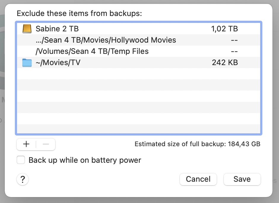and your external/s combined. The bigger, the better, as you'll be able to keep backups for that much longer, then TM starts auto deleting the oldest. For some of my backups, I'm using a pair of 5TB Seagate's from Amazon that cost just €120 each. I now have 3 TM backups of all our stuff kept in 3 separate locations.