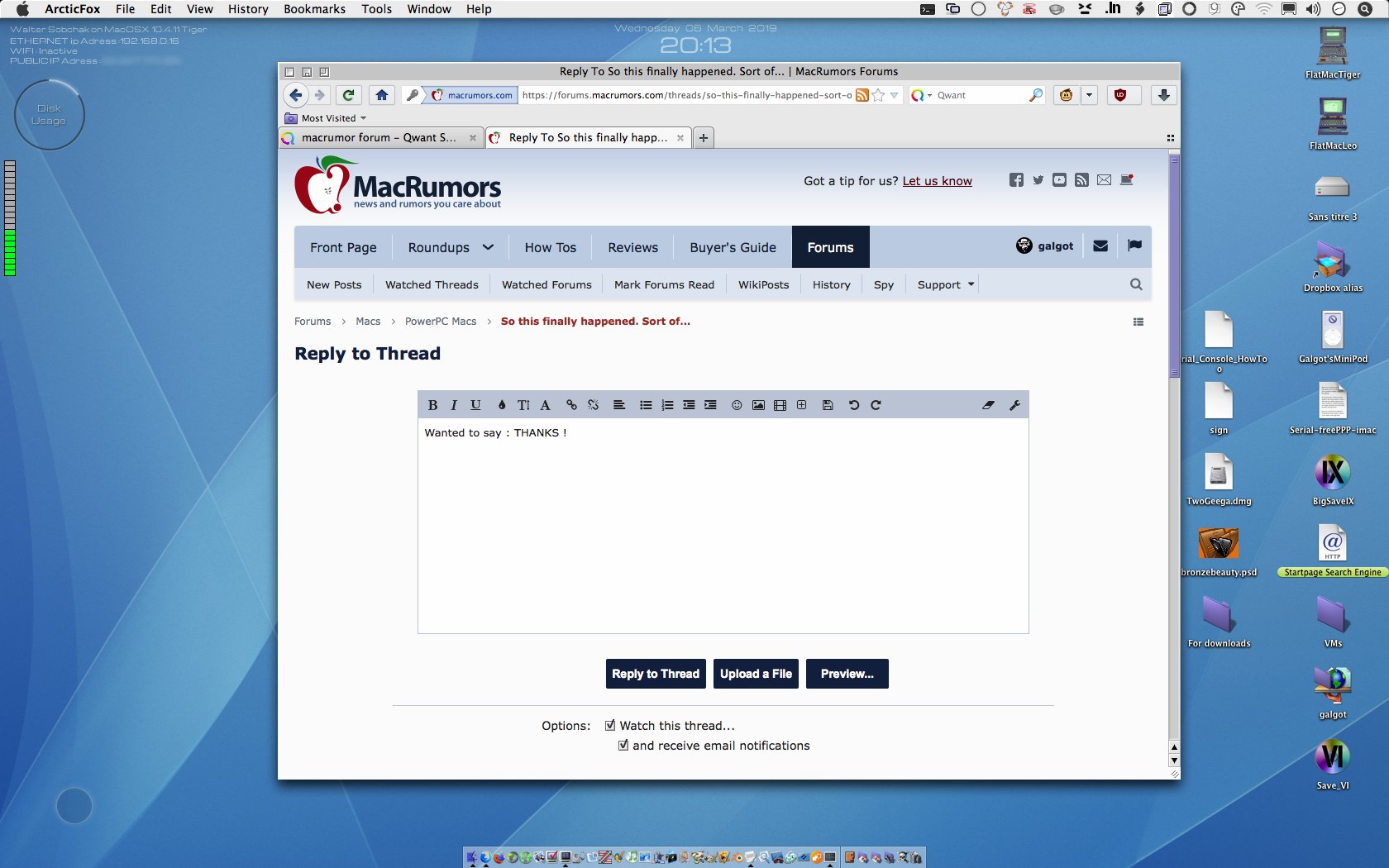So it was with great interest that I learned about Arctic Fox. Downloaded 64 bit 10.6 and up version and fired it up. Did not import any old settings or bookmarks. WOW. What a contrast. Lightning fast and, frankly, a better browser experience in terms of speed than any I've used since 2009. Even a site like Salon, which drowns me in videos and pop-ups, was very fast to scroll and move around in. For about 20 minutes, I was in heaven.