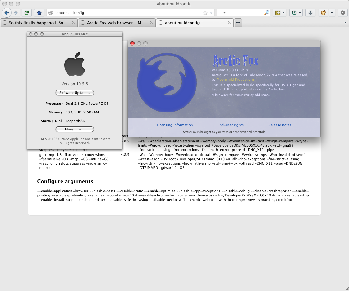 It's really not that easy. This was just a one-off side project of mine a few years ago. It wasn't part of the official project or source. While i got close, the browser was still partially broken (bookmarks broken, downloads window broken, having to manually add extensions / themes, packaging was broken, and a few other quirks). I ended up manually adding in some of the old TFF38 patches and some other hacks to get what i got posted here. Sadly the HDD in that G5 bit the dust taking everything on it to the grave. I never bothered attempting it again after that as it took months to get that far, and it's code base wasn't any newer than TFF's. So rendering the modern web wasn't going to happen with it, and i saw no need to pursue it again.