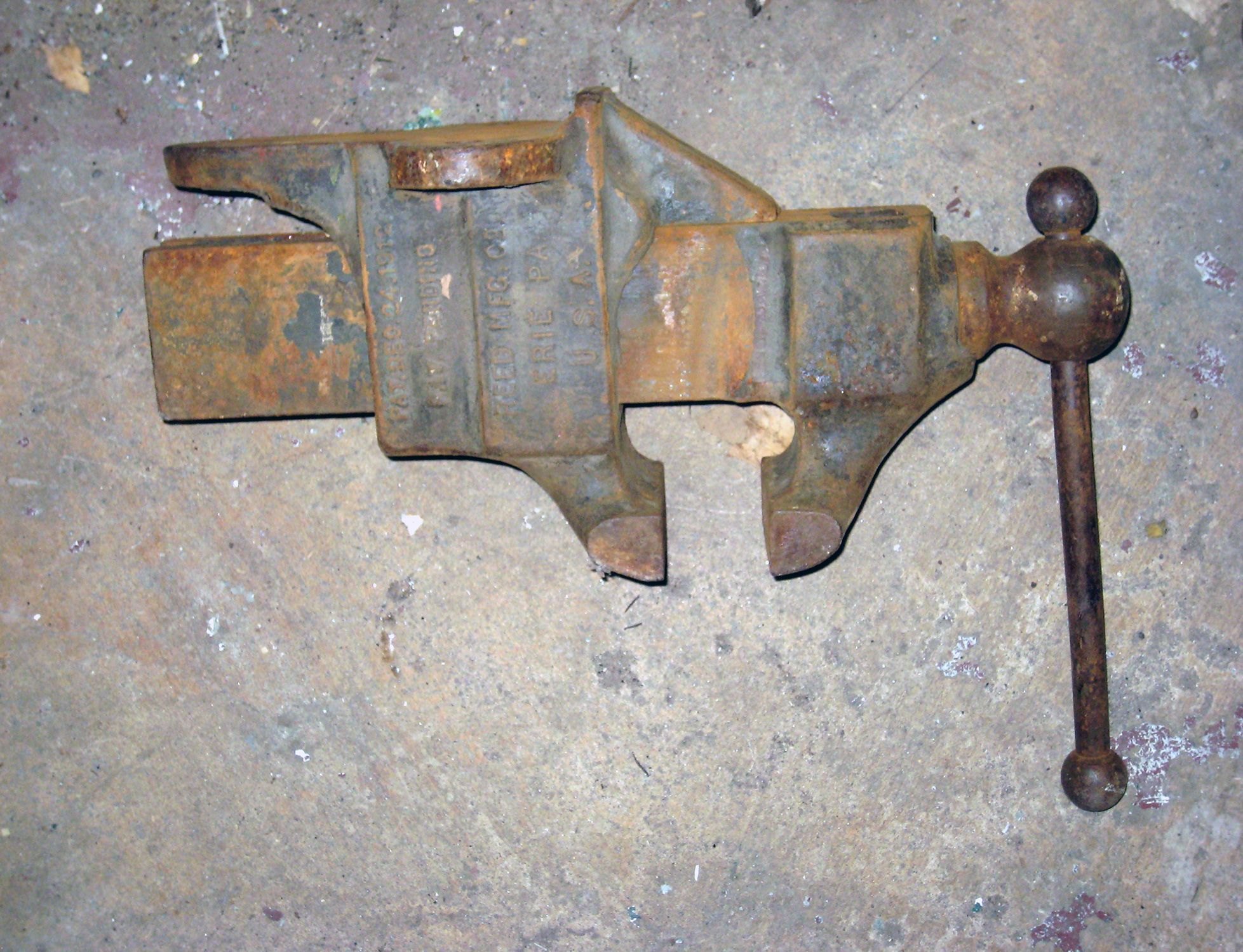 it's a Reed 104 , probably 90-100 years old , weighs around 50 lbs or so. I'd mentioned to a relative that I broke the crap Chinese vise that was in my garage and was looking for a classic 40 year + old American vise to replace it . And this appeared ,delivered by an unhappy postal worker. It'll clean up fine , just need a week of 50 degree plus weather to get the paint stripped off , and the rust taken care of in my electrolysis tank .