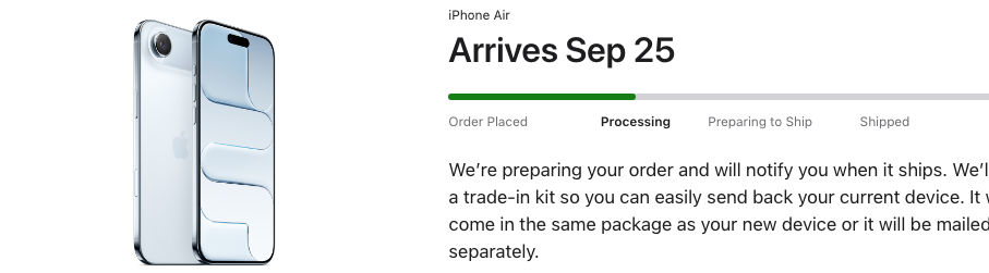 iPhone 17 Air ordered 3 minutes after site opened this morning and got 9/25 delivery day.
