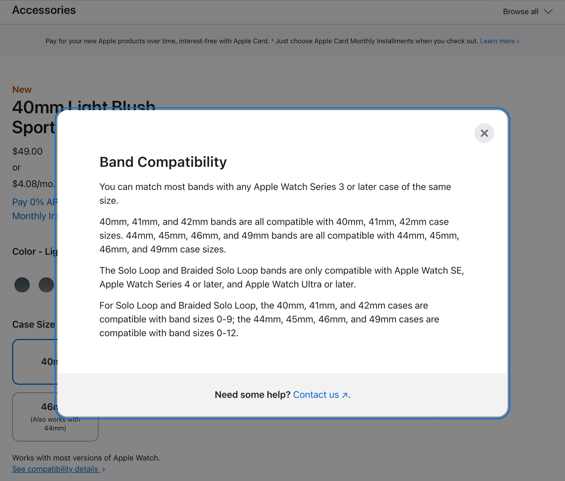 For Solo Loop and Braided Solo Loop, the 40mm, 41mm, and 42mm cases are compatible with band sizes 0-9; the 44mm, 45mm, 46mm, and 49mm cases are compatible with band sizes 0-12.
