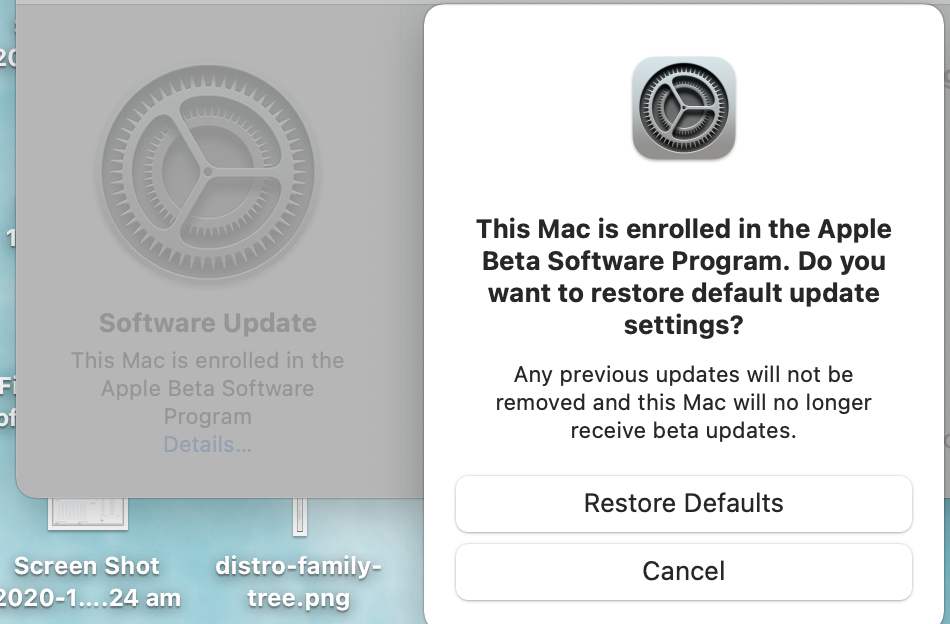 Yea I did that. For some reason after performing these steps, the “Details” section disappears, but it still prompts me to a beta update being available. I think it’s a bug unfortunately.Once you have re-enrolled, you will get the little notification that you are enrolled in the Beta program. Click on the blue 'Details' and this second dialog box pops up. Click on 'Restore Defaults' and you should be right.