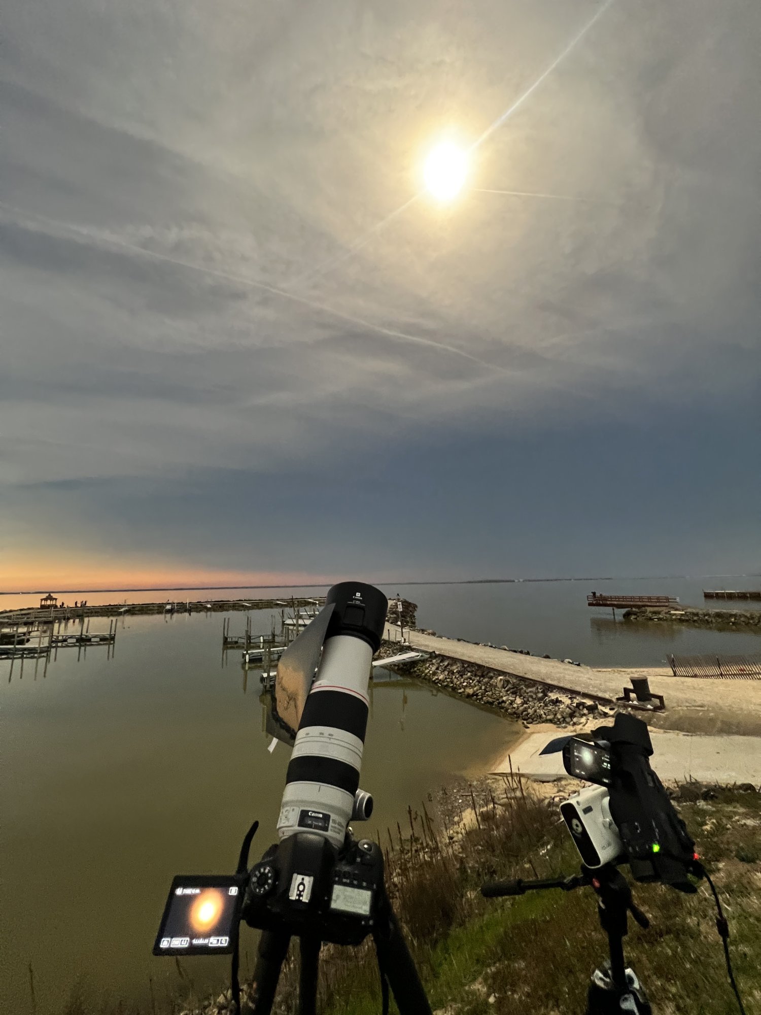 Our ultimate success depended on the cloud cover, so we were biting our nails as the moon crossed in front of the sun, peeking in and out of the clouds. Then the clouds cleared, just in time, 10 minutes before totality, and we had a clear view from then on.