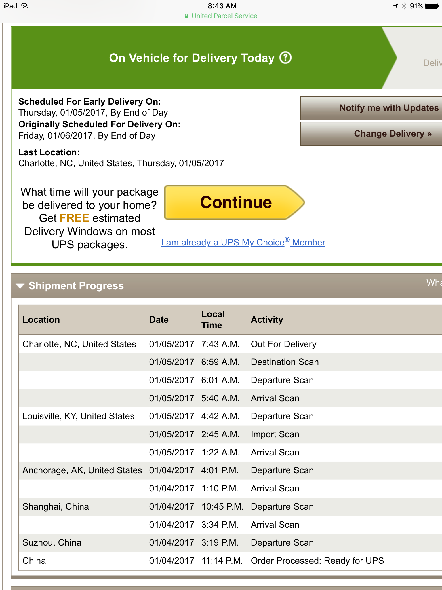 [doublepost=1483667926][/doublepost]Meanwhile, UPS pushed my delivery back until a Tuesday, but hasn't updated their tracking detail since the day it shipped.