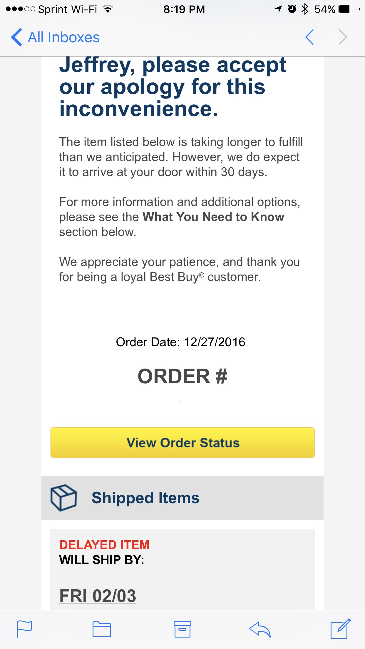 Just for laughs BB 12/27 order update - "We'll notify you as soon as we ship it".